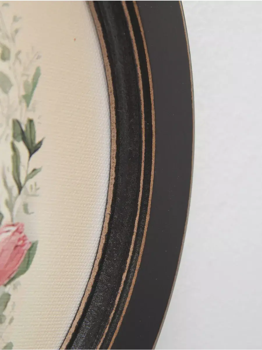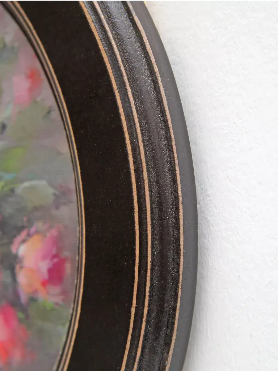 Рама изготовлена из цельного листа МДФ 16 мм, не имеет зазоров и стыков. Окрашена экологичной акриловой эмалью в белый цвет. Диаметр картины 27 см, диаметр изображения 20 см. Крепление для стены в комплекте.