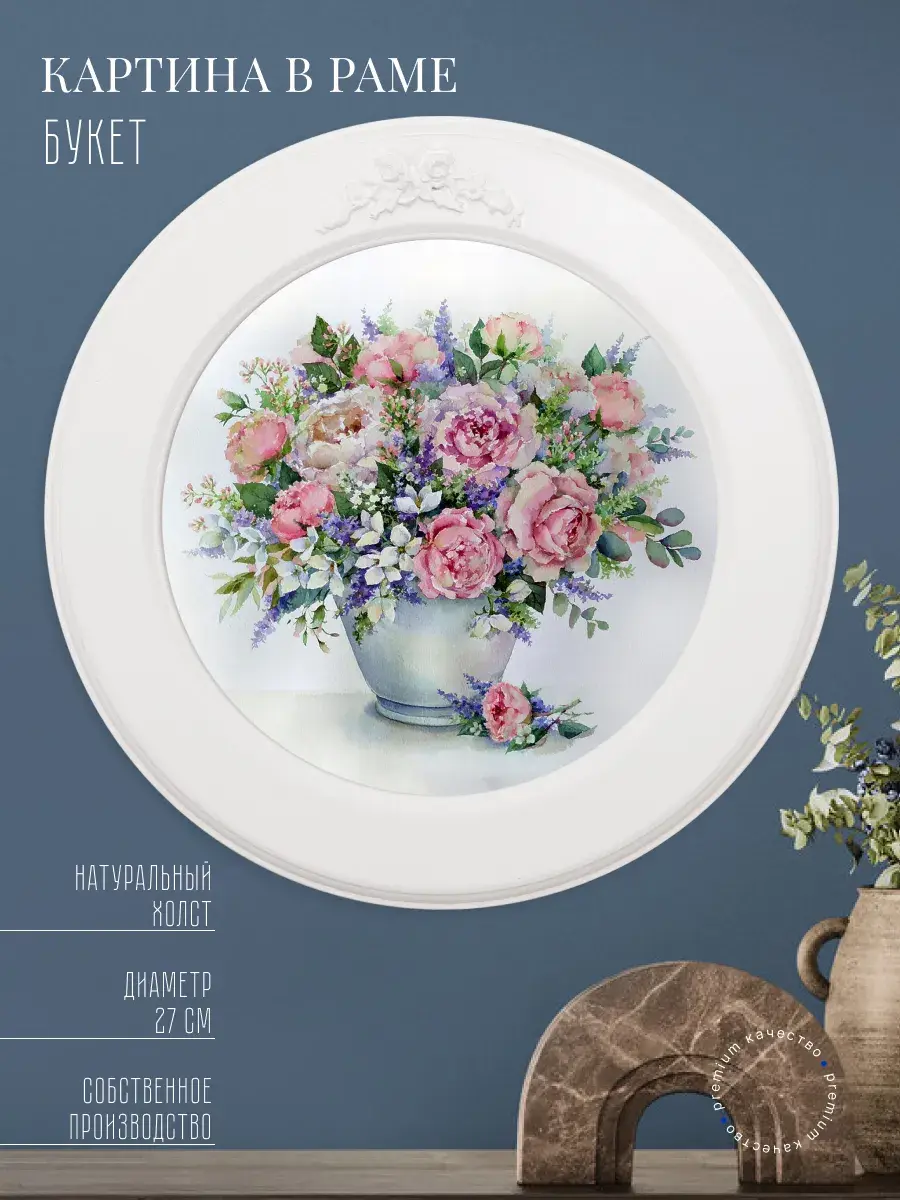 Картина напечатана на натуральном холсте, покрыта матовым лаком в круглой белой раме, станет прекрасным украшением интерьера. Множество вариантов дает возможность создать собственную коллекцию. Рама изготовлена из цельного листа МДФ 10 мм, не имеет зазоров и стыков. Окрашена экологичной акриловой эмалью в белый цвет. Крепление для стены в комплекте.