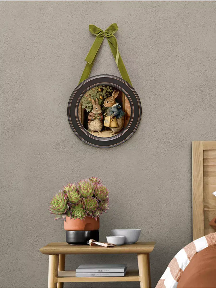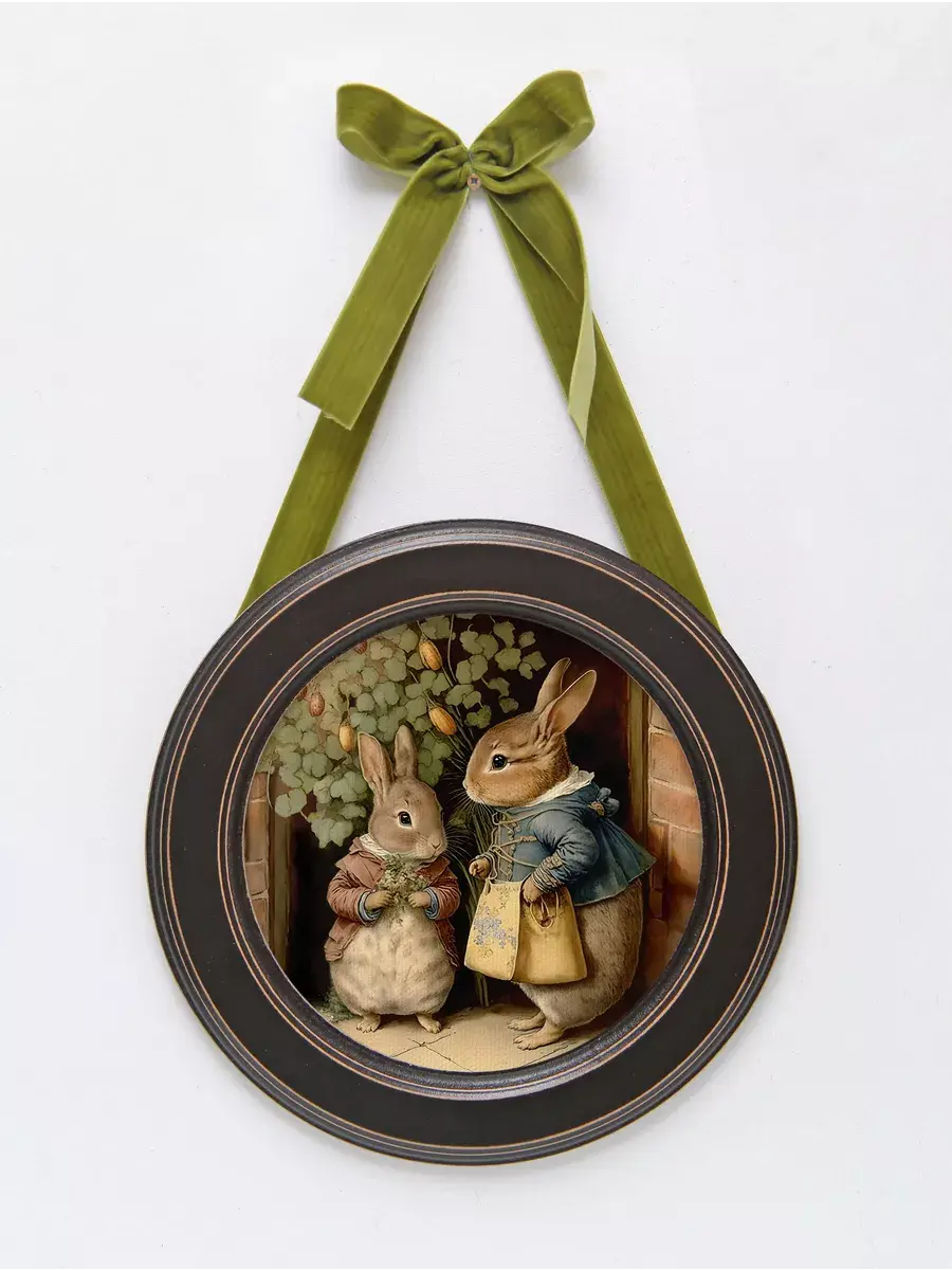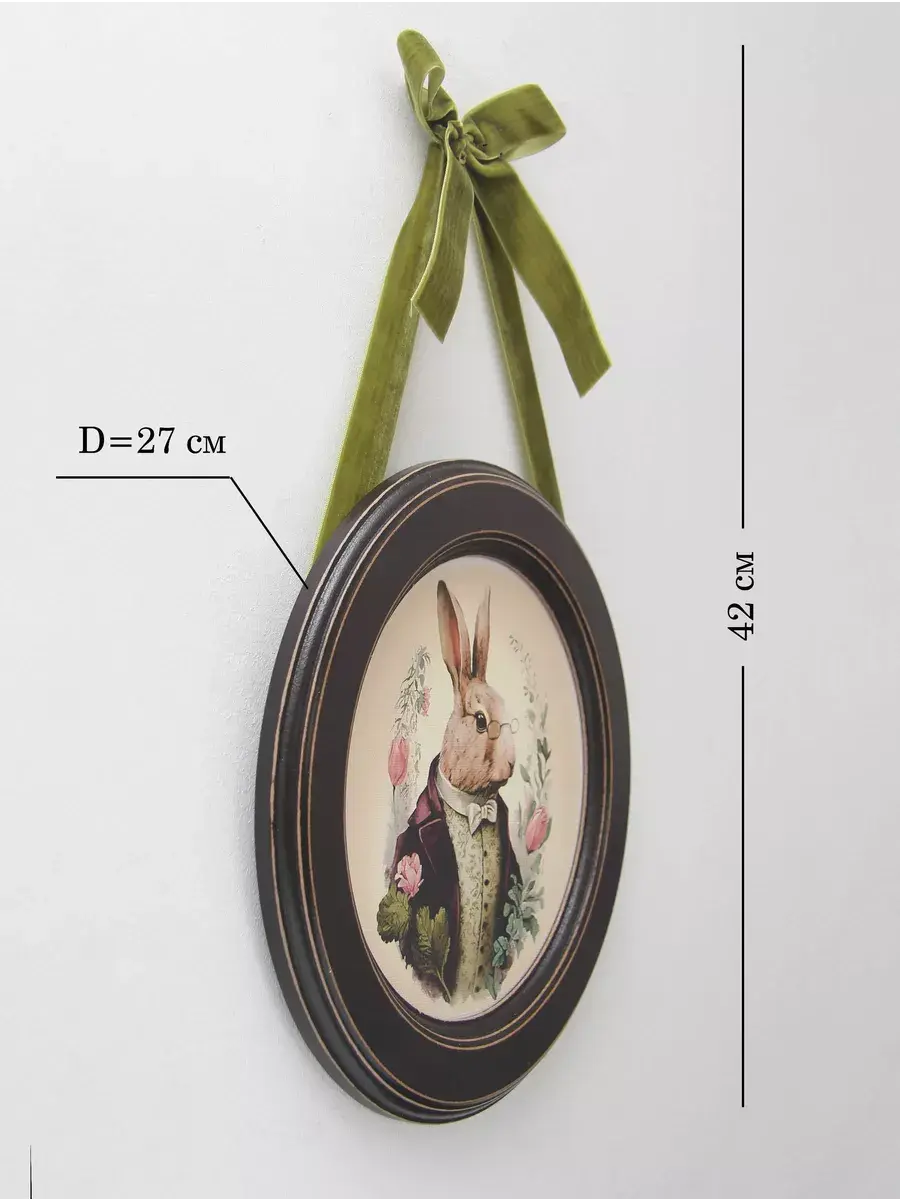 Настенный декор в нежных пастельных тонах с милыми зайчиками в раме приятного шоколадно-коричневого цвета. Бархатная лента благородного зеленого цвета добавляет картине изысканности. Картина напечатана на натуральном холсте, покрыта матовым лаком станет прекрасным дополнением и украшением интерьера.