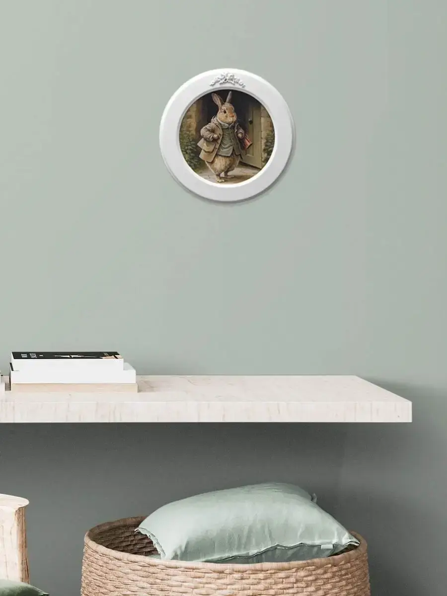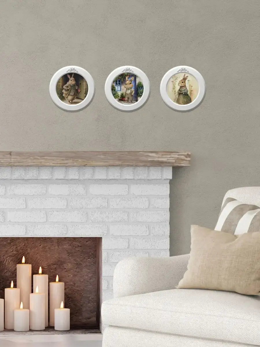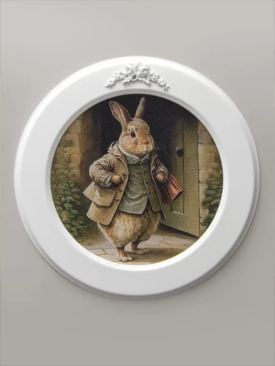 Настенный декор в нежных пастельный тонах с милыми зайчиками в белой раме с лепниной.