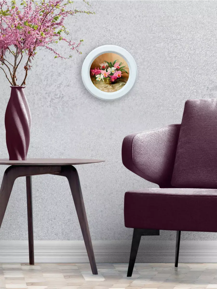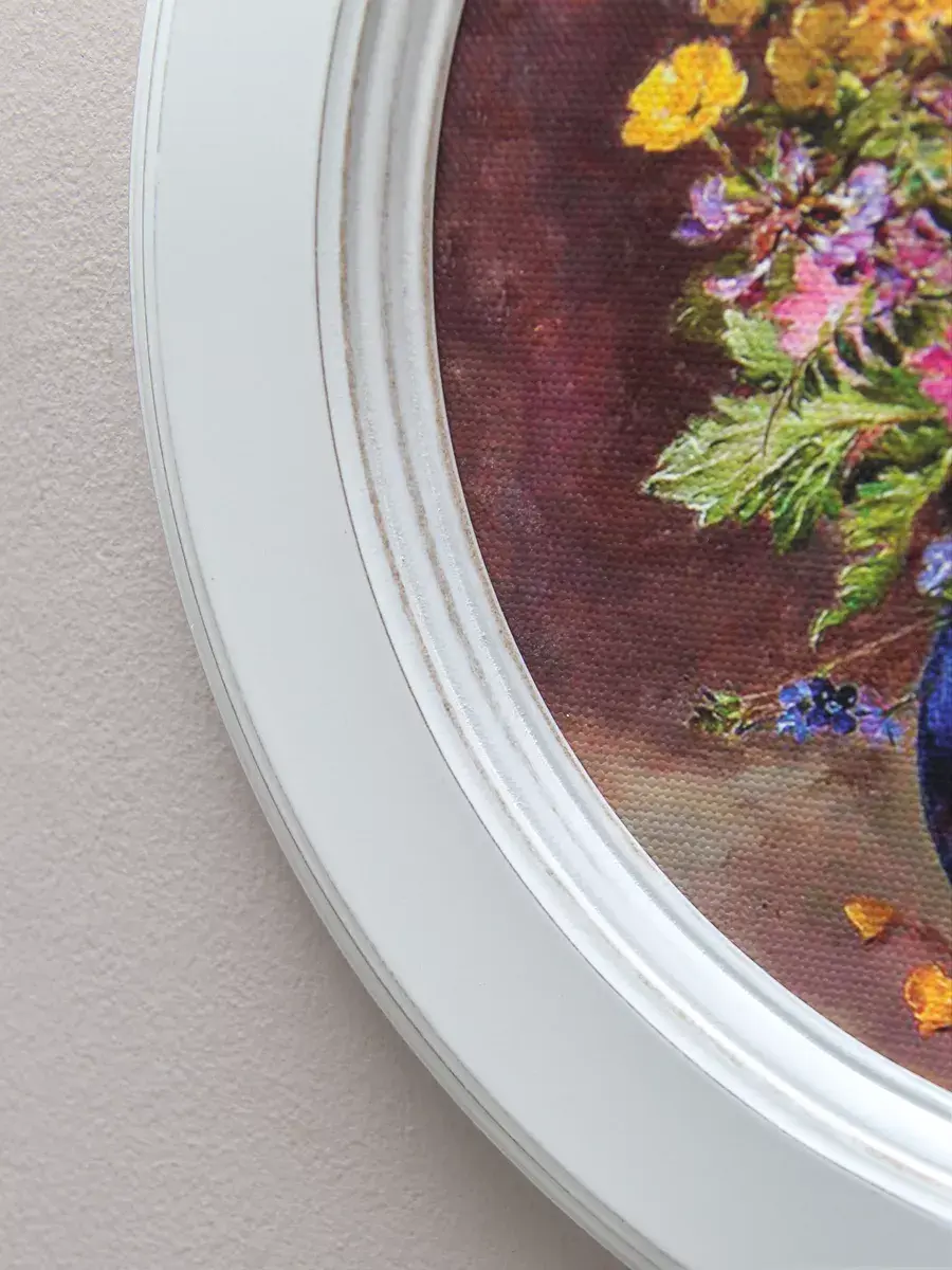 Картина напечатана на натуральном холсте, покрыта матовым лаком в круглой белой раме станет прекрасным украшением интерьера. Рама состарена вручную. Множество вариантов дает возможность создать собственную коллекцию. Композицию из нескольких картин можно дополнить зеркалом, оформить свои творческие работы или фотографии в раму. Картины с лавандой и разнообразными букетами прекрасный подарок. Настенные картины для украшения дома и дачи, добавят уюта на кухне и в детской комнате. Рама изготовлена из цельного листа МДФ 16 мм, не имеет зазоров и стыков. Окрашена экологичной акриловой эмалью в белый цвет. Диаметр картины 27 см, диаметр изображения 19 см. Крепление для стены в комплекте.