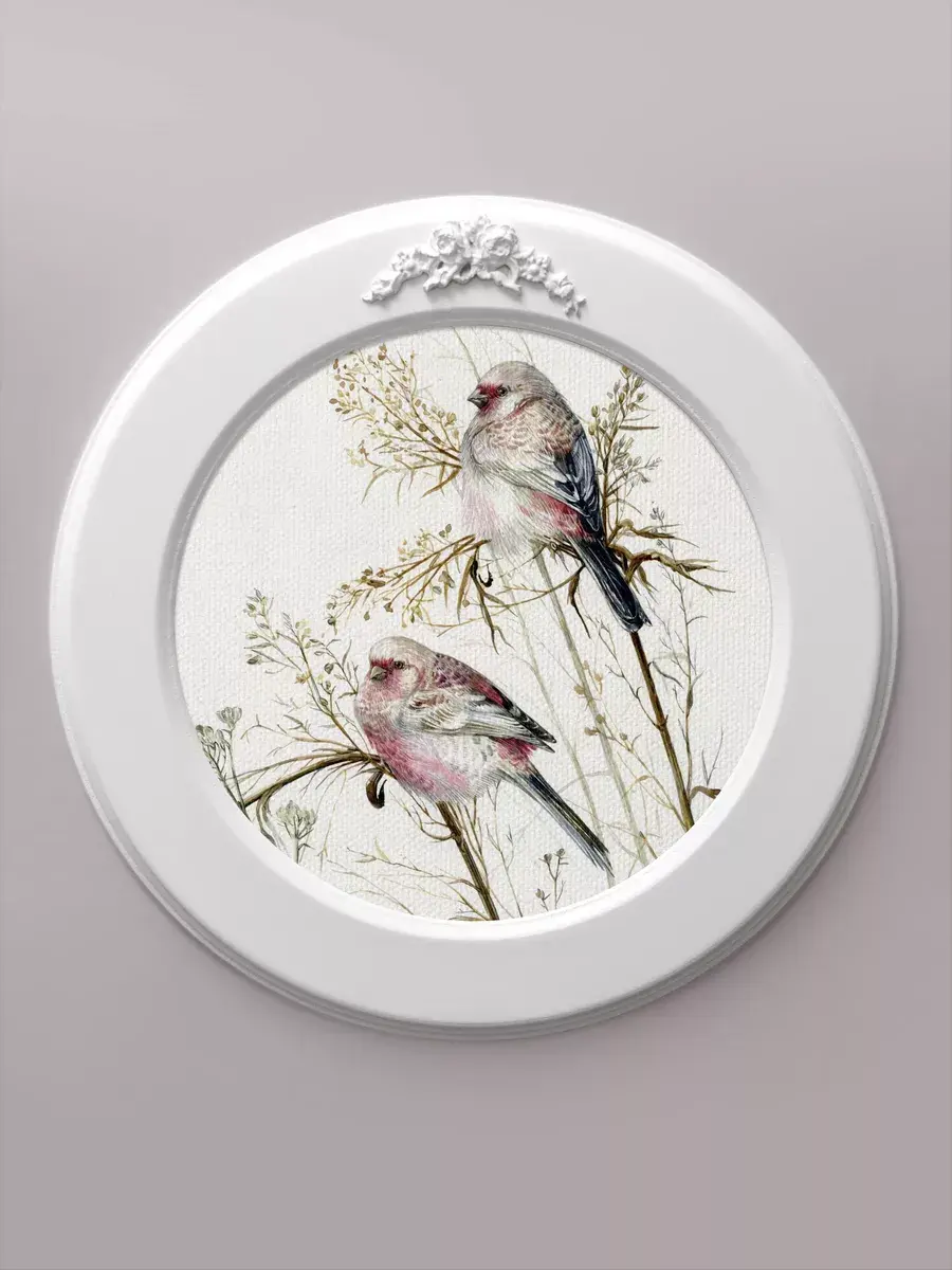 Настенный декор в нежных пастельных тонах с птичками в белой раме с лепниной. Эта не большая картина станет стильным акцентом в интерьере. Она идеально подойдет для оформления стен в различных помещениях: от кухни до спальни, от гостиной до прихожей. Настенное панно выполнено на холсте и отличается яркими цветами, изображающими природу и цветы, что придаст уют и свежесть любому дому или квартире. Декоративное оформление в рамке добавит элегантности и завершенности, делая картину не только предметом декора, но и важной частью атмосферы вашего пространства. Это решение отлично впишется в интерьер офиса, зала или любой комнаты, создавая ощущение счастья и гармонии. Пусть данное предметы искусства придаст вашему дому индивидуальность и изысканный стиль.