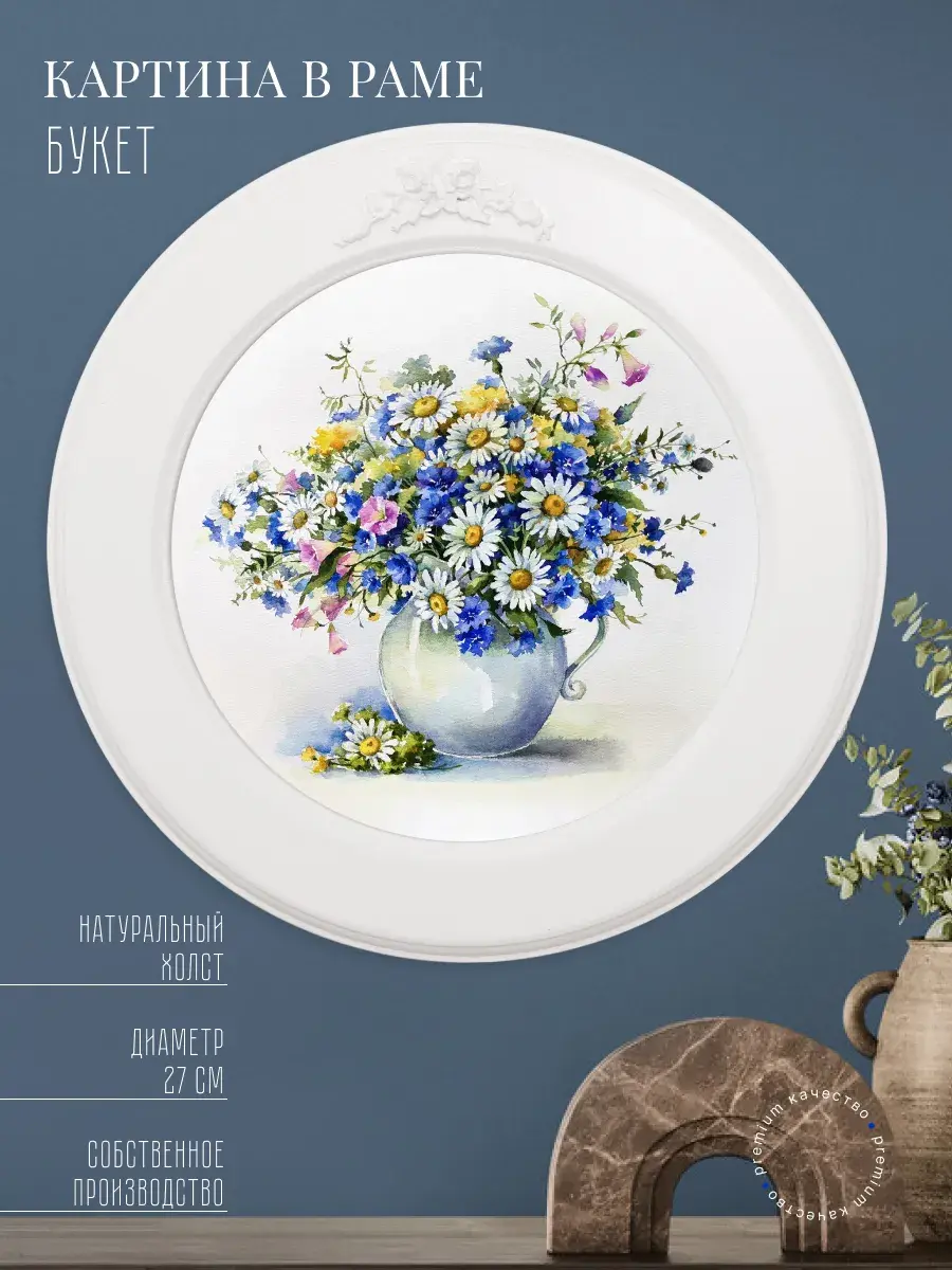 Картина напечатана на натуральном холсте, покрыта матовым лаком в круглой белой раме, станет прекрасным украшением интерьера. Множество вариантов дает возможность создать собственную коллекцию. Рама изготовлена из цельного листа МДФ 10 мм, не имеет зазоров и стыков. Окрашена экологичной акриловой эмалью в белый цвет. Крепление для стены в комплекте.