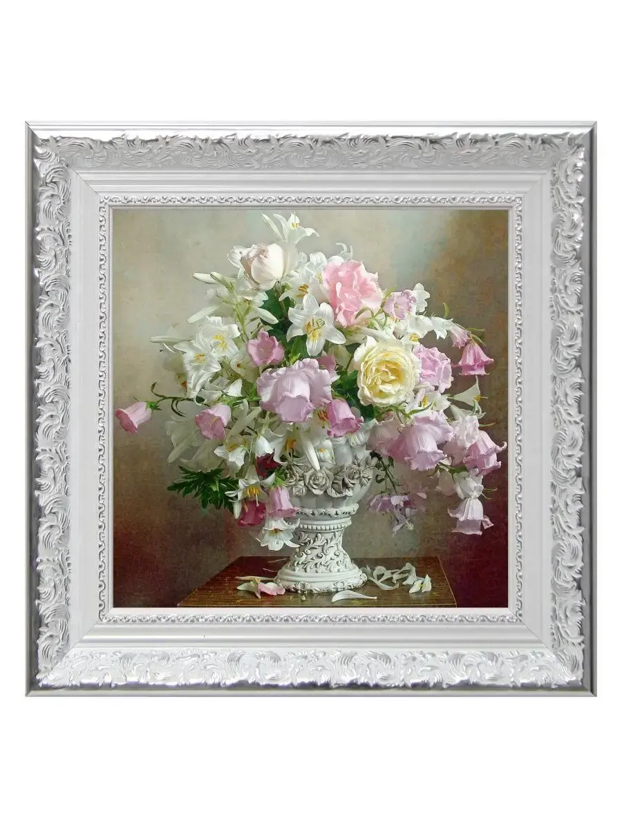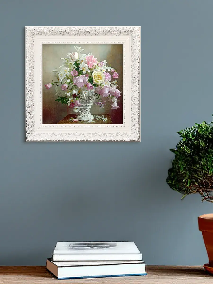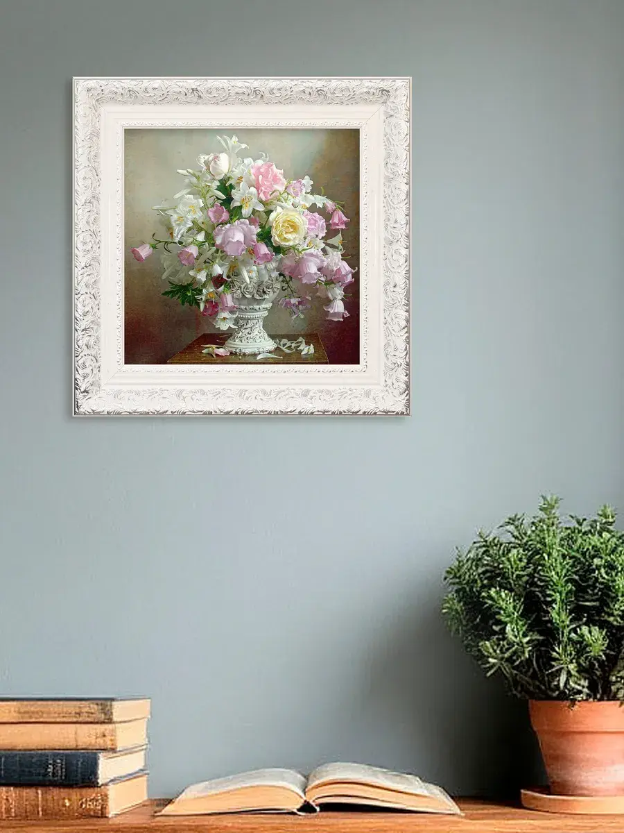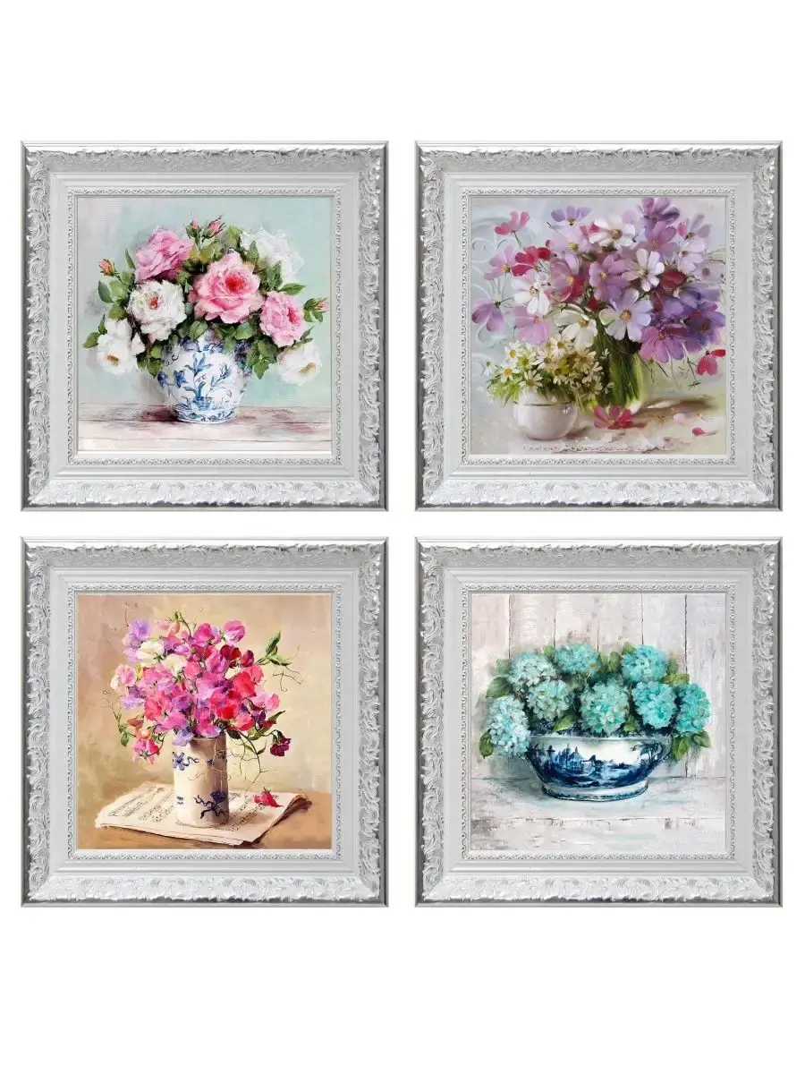 Для картин подходит полочка. Картина напечатана на натуральном холсте, покрыта лаком. Для защиты от провисания холст наклеен на хдф. Рама из полиуретана белоснежная с позолотой. Картины небольшого размера (холст 20*20 см) для создания коллекций. Размер картины с рамой 27х27 см. Коллекция картин идеально подходит к полкам в багетной раме.