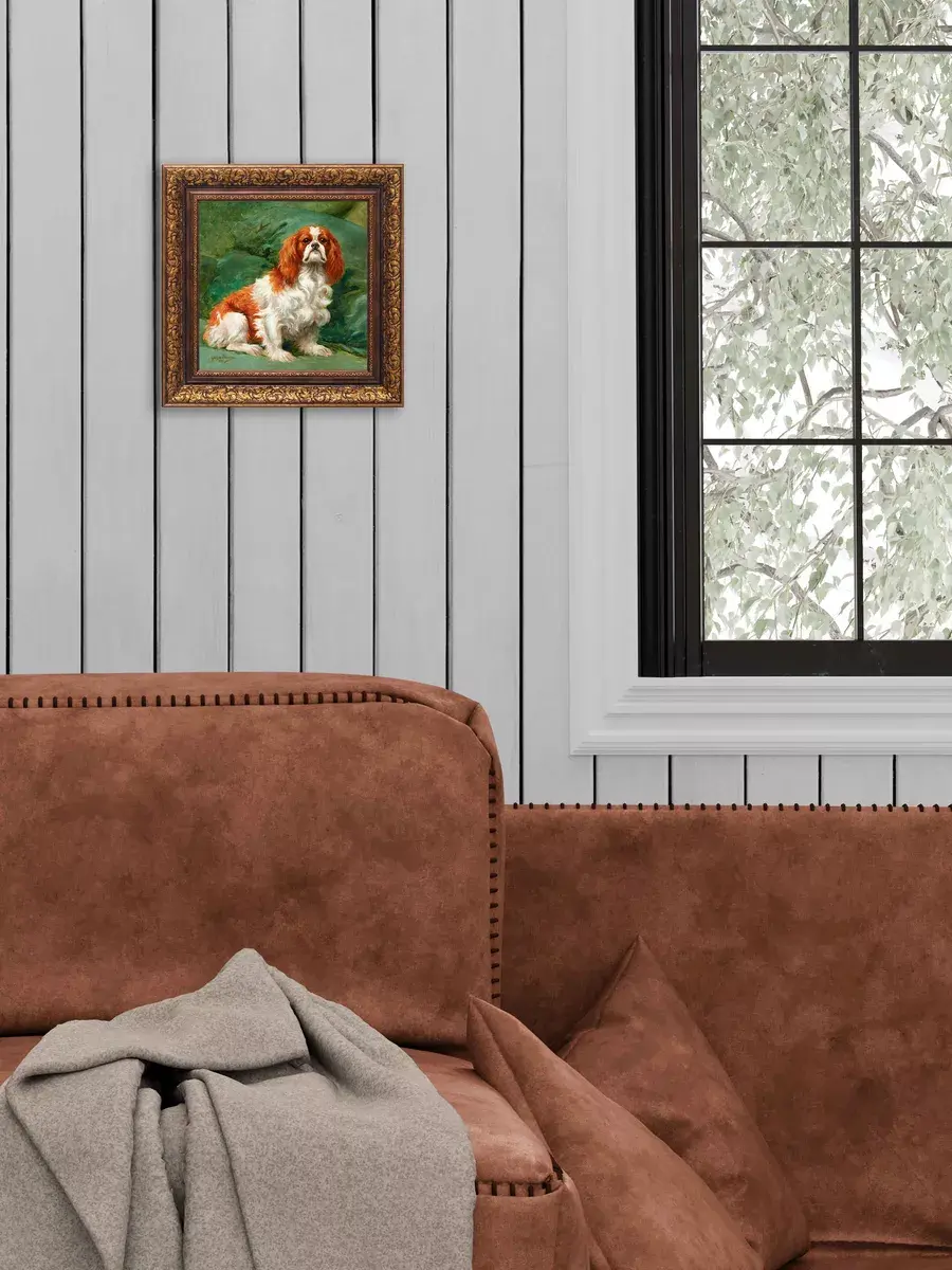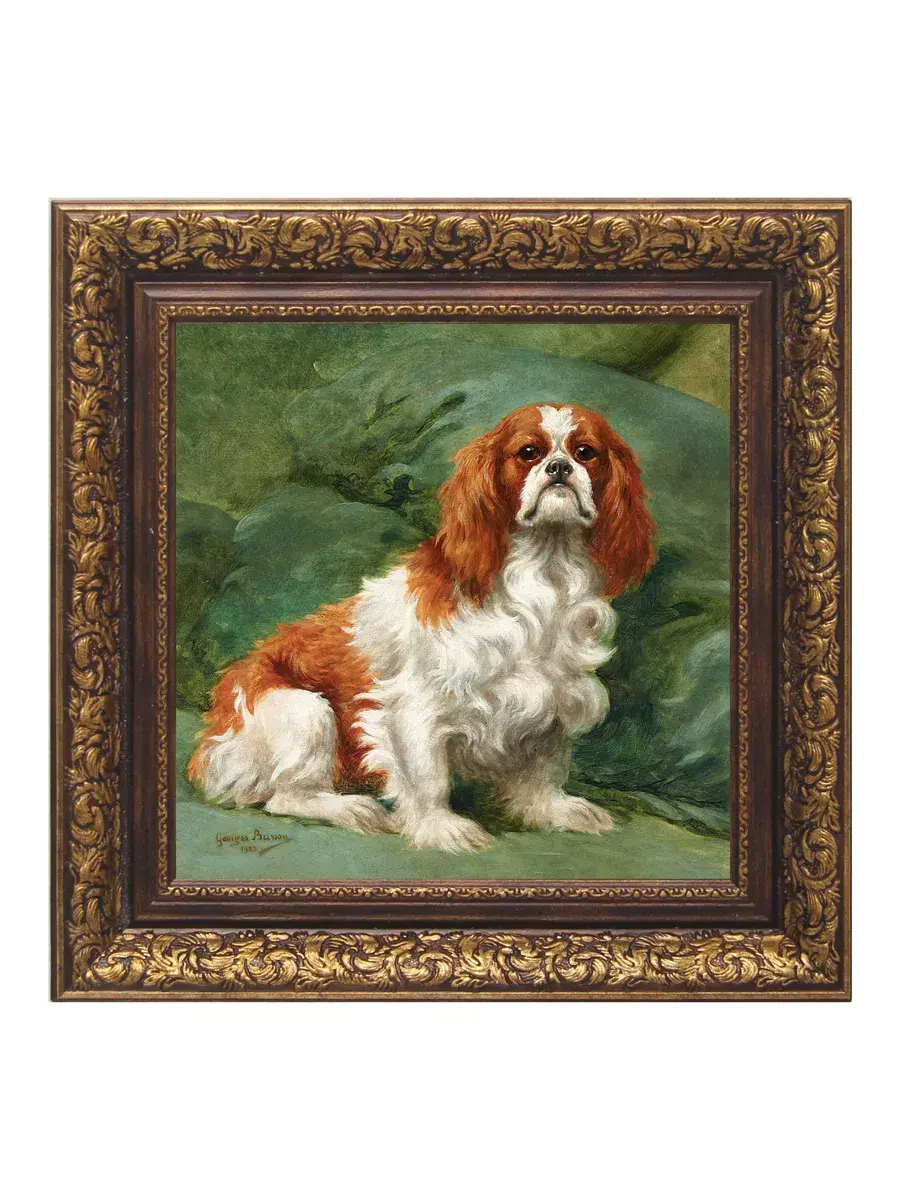 Картина художника Эдуарда Мане Кинг Чарльза с изображением собак для создания коллекций в классическом стиле. Украшение для стен дома, гостиной, прихожей, спальни, детской, оформления кабинетана, для создания уютной атмосферы на даче. Картины в золотой классической раме подойдет для оформления стен в кафе и ресторане. Картина напечатана на натуральном холсте, покрыта лаком. Для защиты от провисания холст наклеен на хдф. Рама широкая из полиуретана, матовая с эффектом старения. Размера холст 20*20 см. Ширина рамы 5,5 см. Картина - это отличный подарок. Крепление для стены в комплекте.