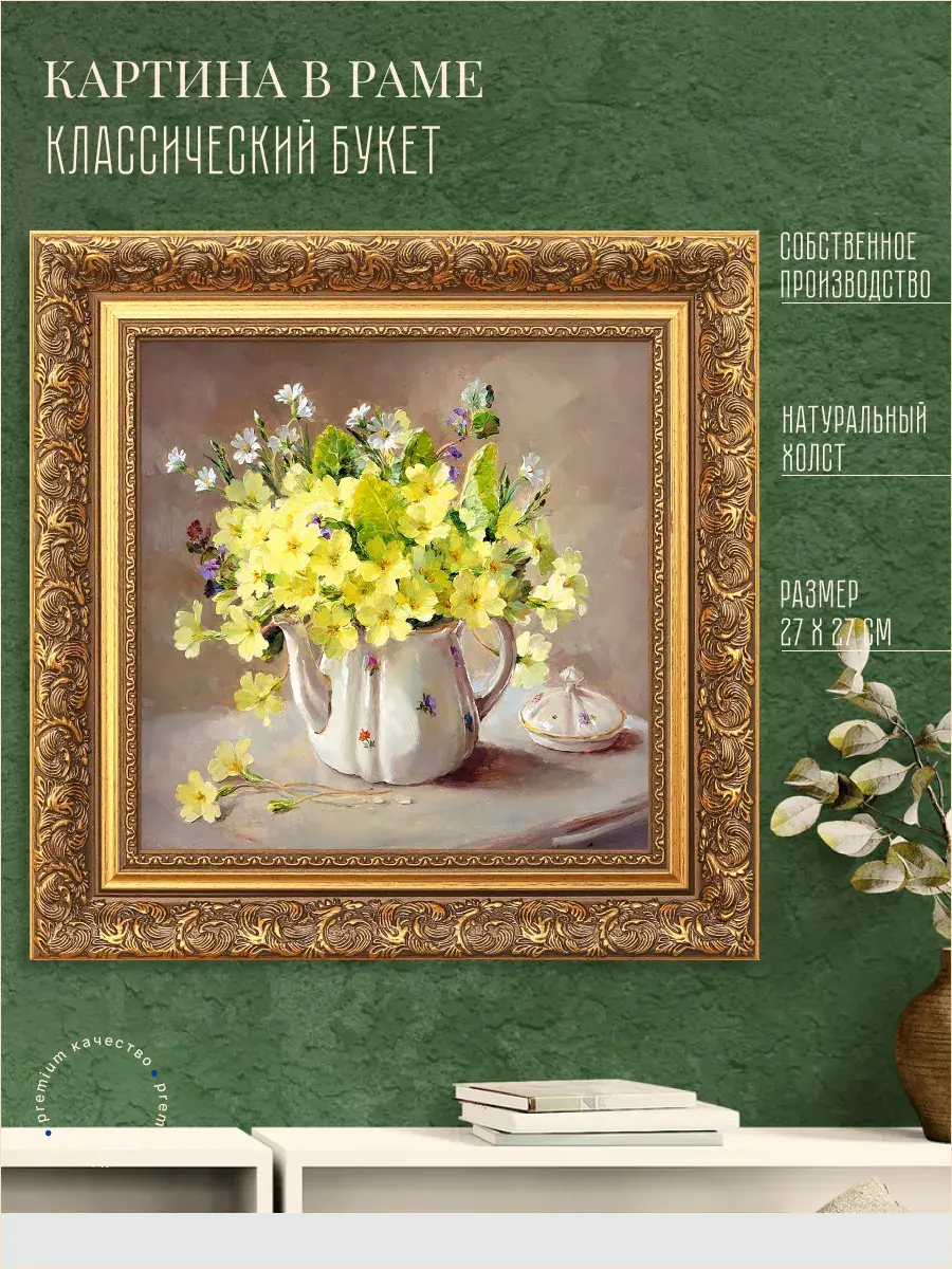 Картина в классической золотой раме "Полевой букет" станет прекрасным дополнением классического интерьера. Добавит вашему дому роскоши и богатства. Картина напечатана на натуральном холсте, поерыта лаком. Не подвержена воздействию солнечного цвета, проста в уходе.Размер картины 31*41 см, размер холста 24*34 см.