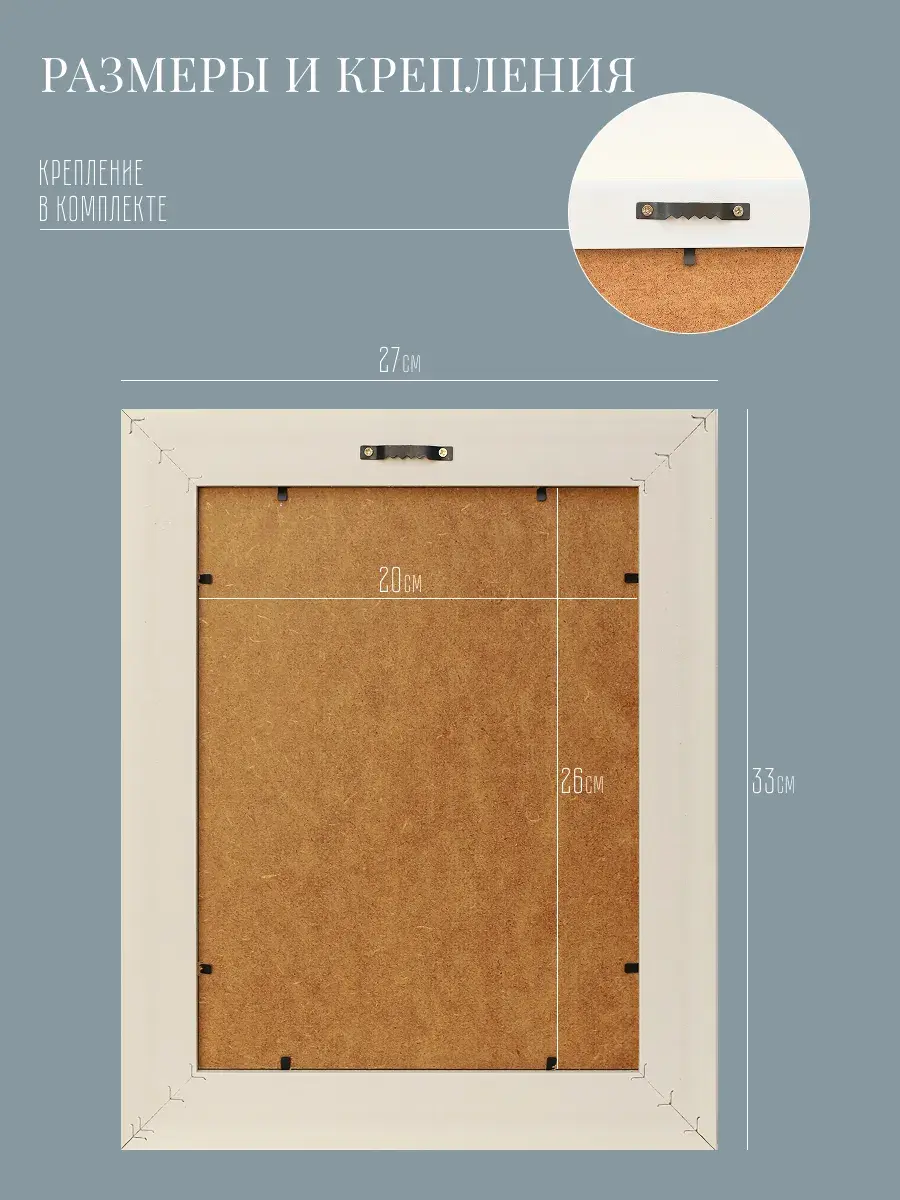 Основа из ХДФ 4мм, на него наклеен холст, что исключает провисание холста. Рама из полиуретана, размер картины с рамой 27*33 см, размер холста 20*26 см. В комплекте шуруп с дюбелем и зубчатый крепеж на раме. Картина упакована в пакет и коробку.