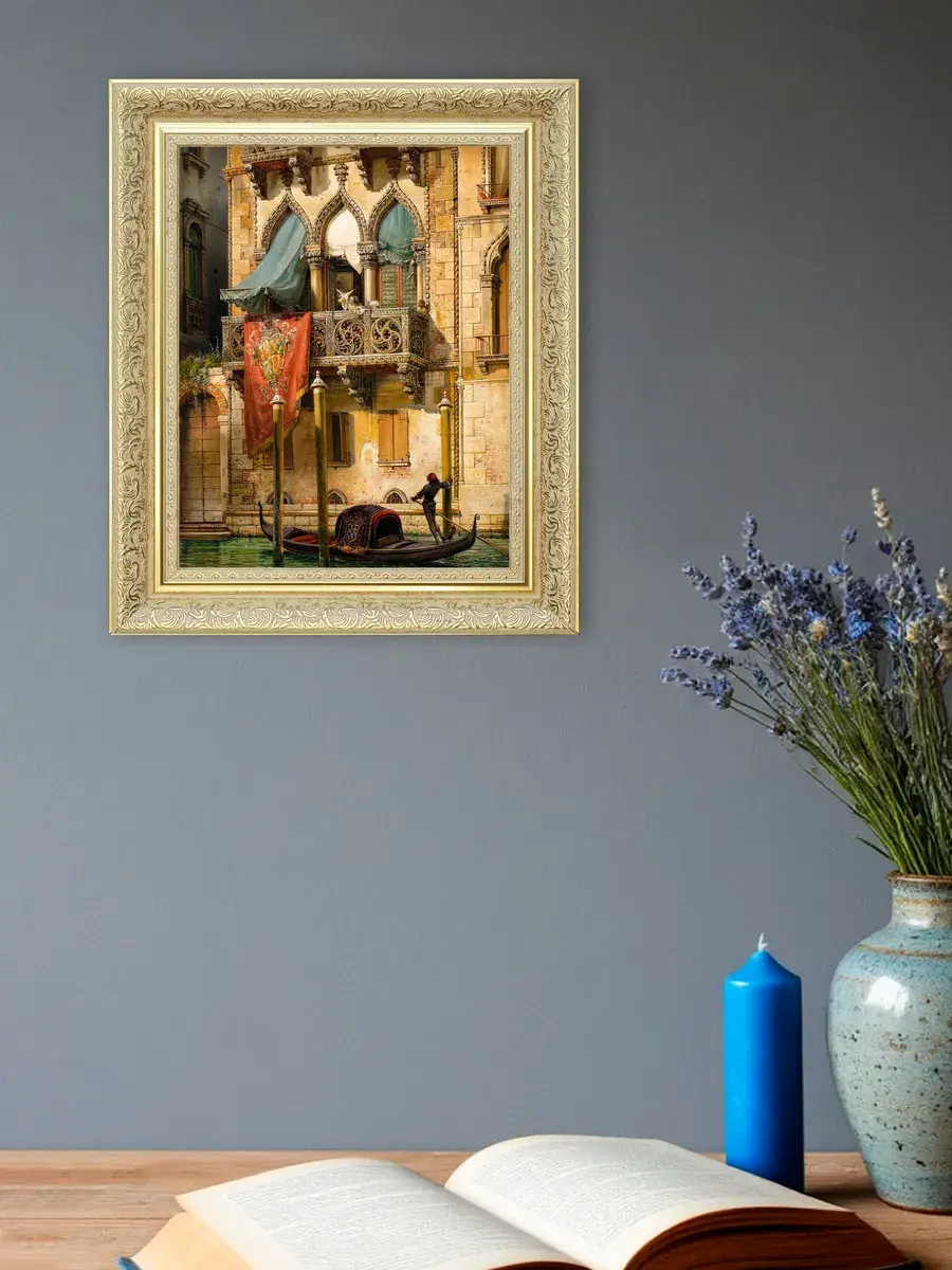 Основа из ХДФ 4мм, на него наклеен холст, что исключает провисание холста. Рама из полиуретана, размер картины с рамой 27*33 см, размер холста 20*26 см. В комплекте шуруп с дюбелем и зубчатый крепеж на раме. Картина упакована в пакет и коробку.
