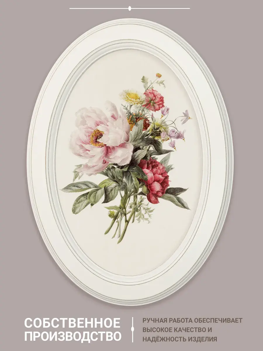 Настенный декор в нежных пастельный тонах. Картина напечатана на натуральном холсте, покрыта матовым лаком, оформлена в овальную белую раму с эффектом состаривания.