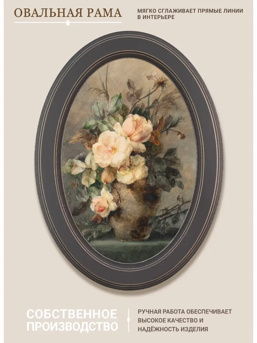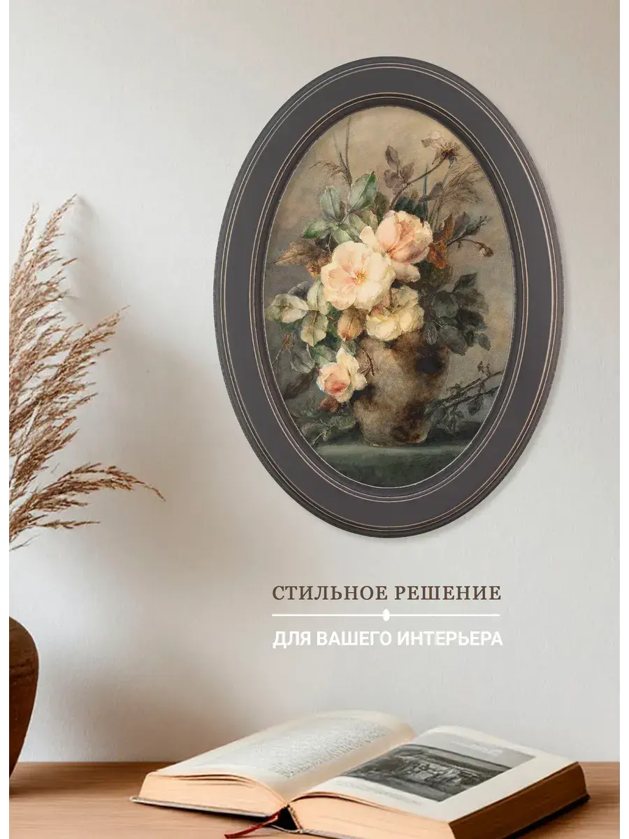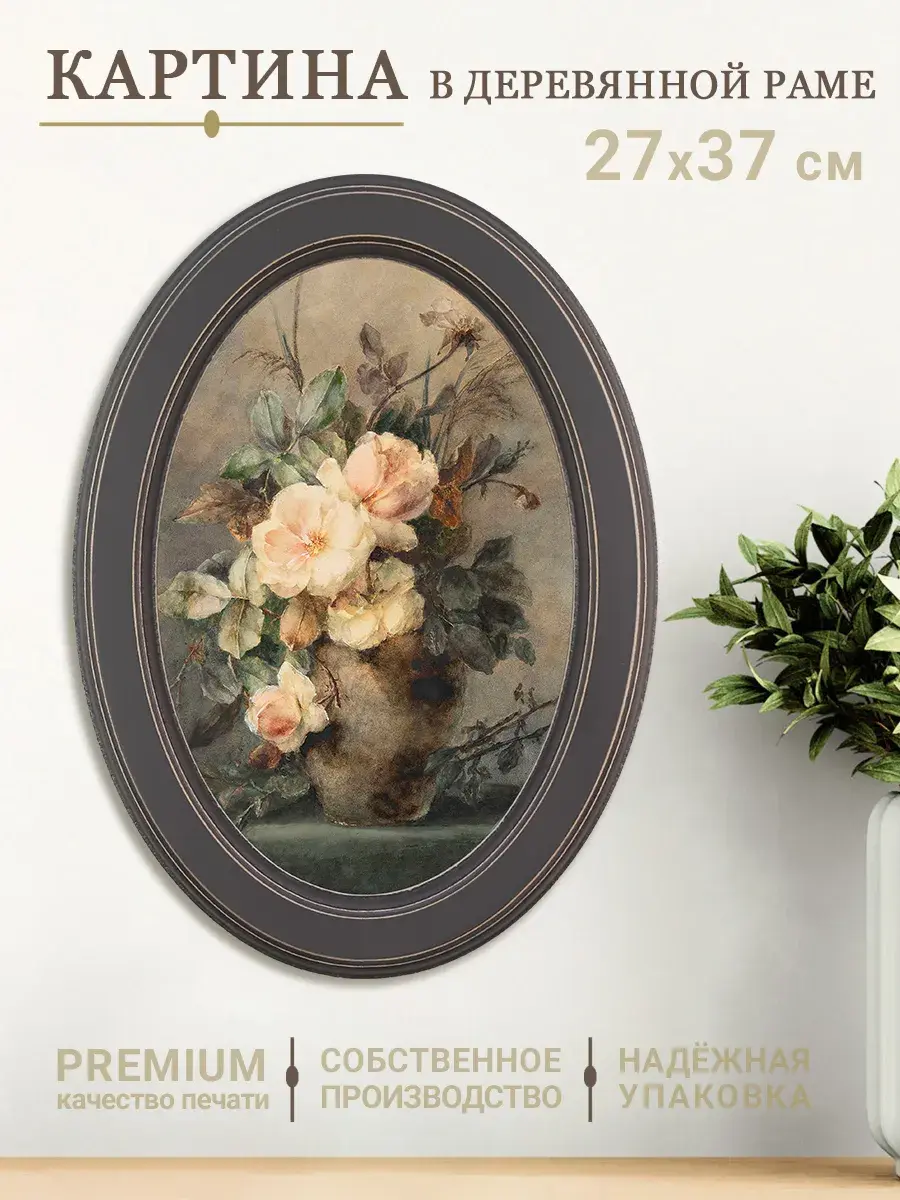Настенный декор в нежных пастельный тонах. Картина напечатана на натуральном холсте, покрыта матовым лаком, оформлена в овальную коричневую раму с эффектом состаривания.