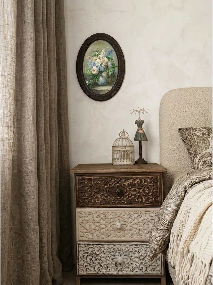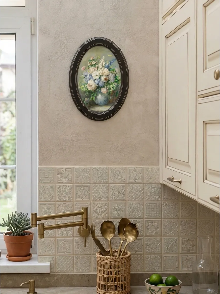 Настенный декор в нежных пастельный тонах. Картина напечатана на натуральном холсте, покрыта матовым лаком, оформлена в овальную коричневую раму с эффектом состаривания.