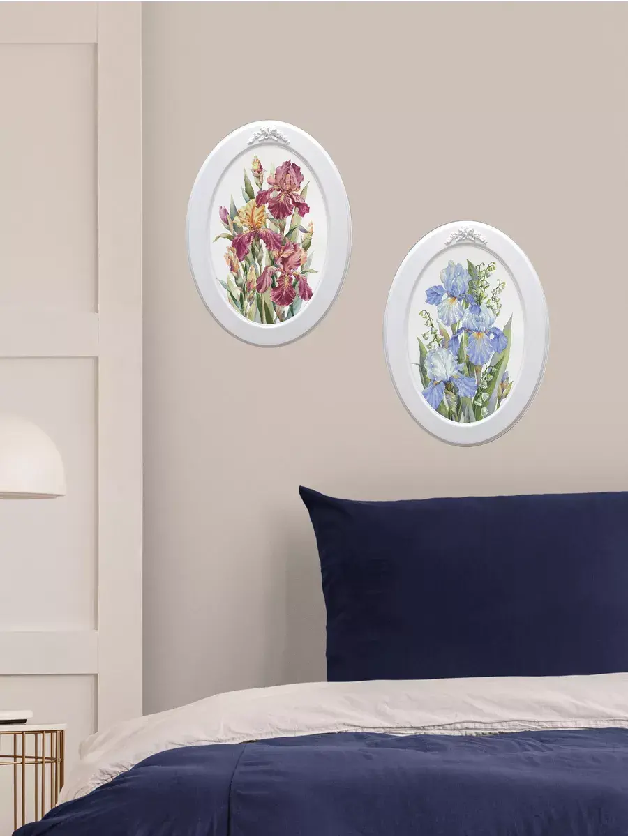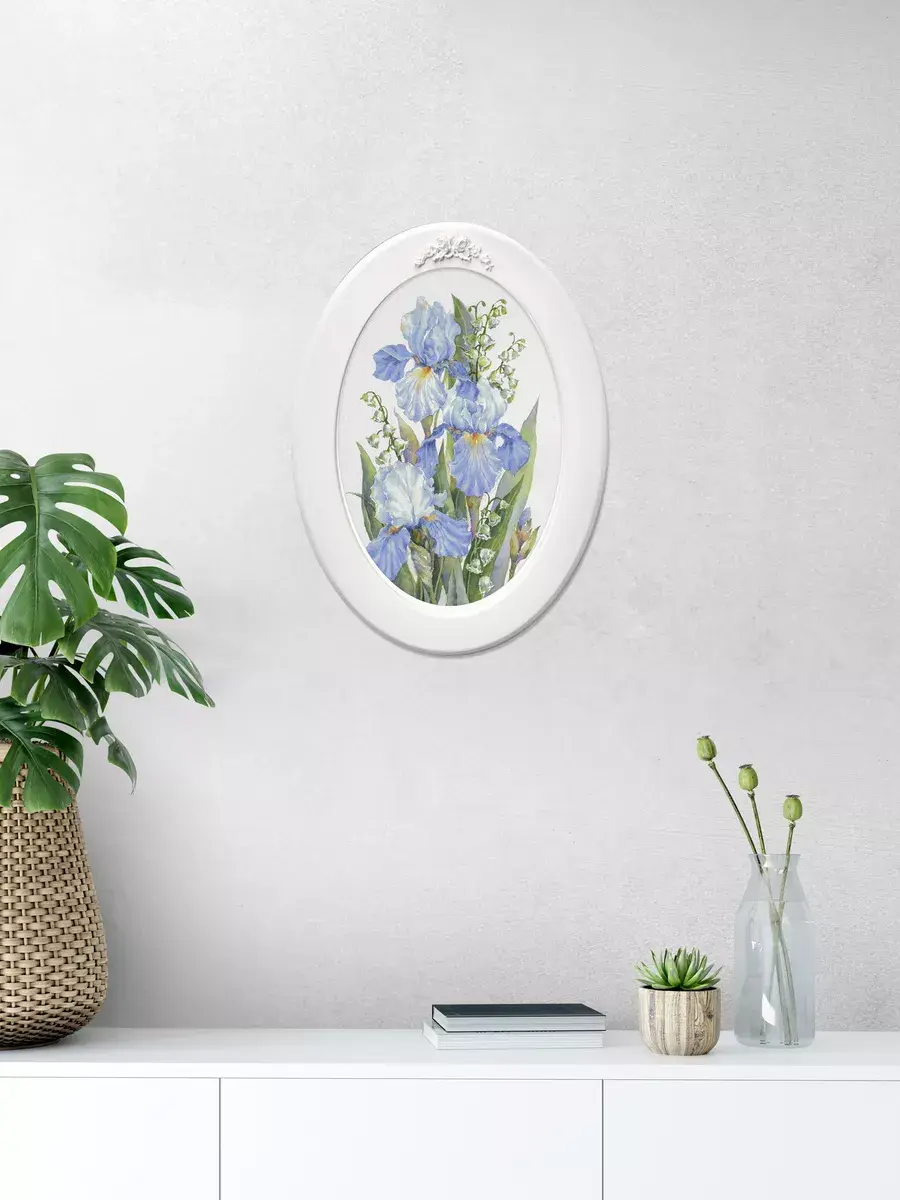 Настенный декор в нежных пастельный тонах. Картина напечатана на натуральном холсте, покрыта матовым лаком оформлена в овальную белую раму с лепниной.
