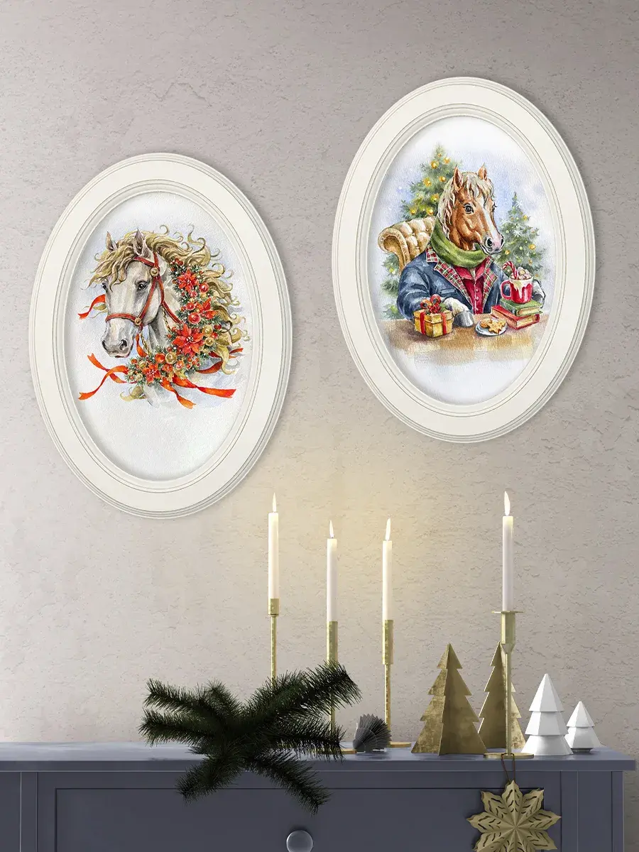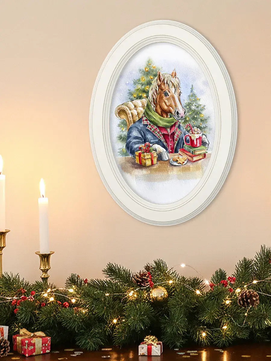 Символ наступающего 2026 года - огненная лошадь. Настенный декор в нежных пастельный тонах. Картина напечатана на натуральном холсте, покрыта матовым лаком, оформлена в овальную белую раму с эффектом состаривания.