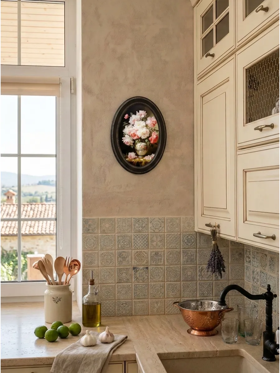 Настенный декор в нежных пастельный тонах. Картина напечатана на натуральном холсте, покрыта матовым лаком, оформлена в овальную коричневую раму с эффектом состаривания.