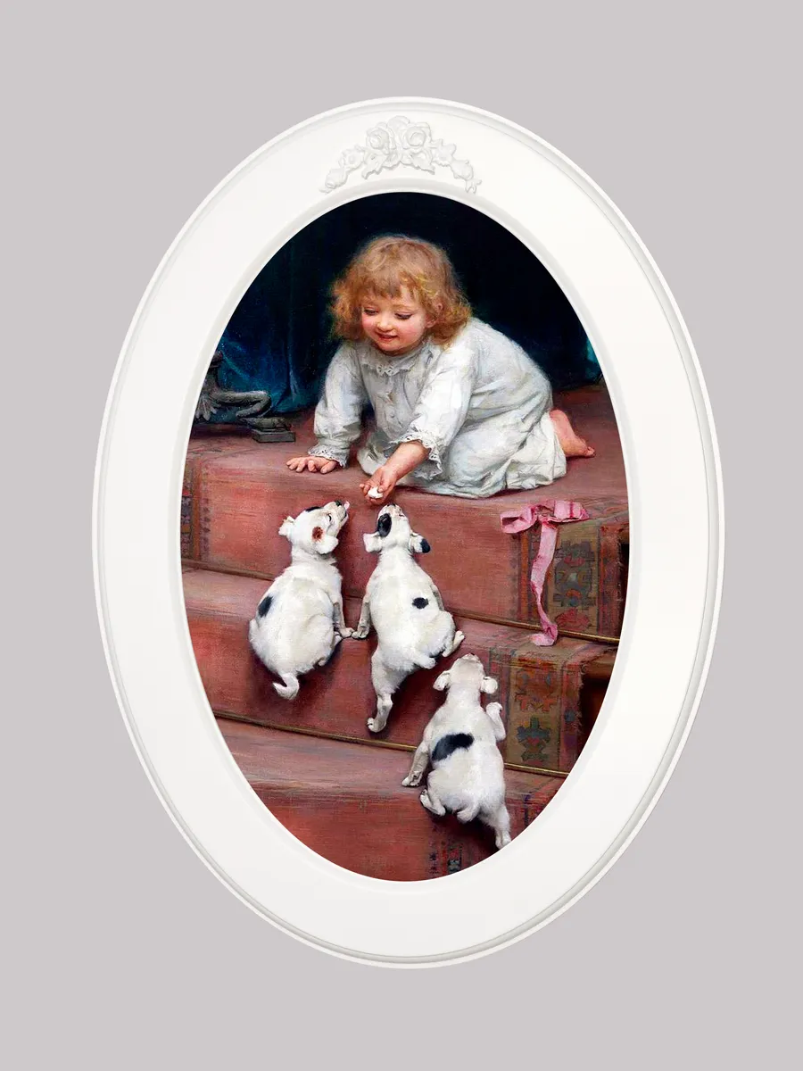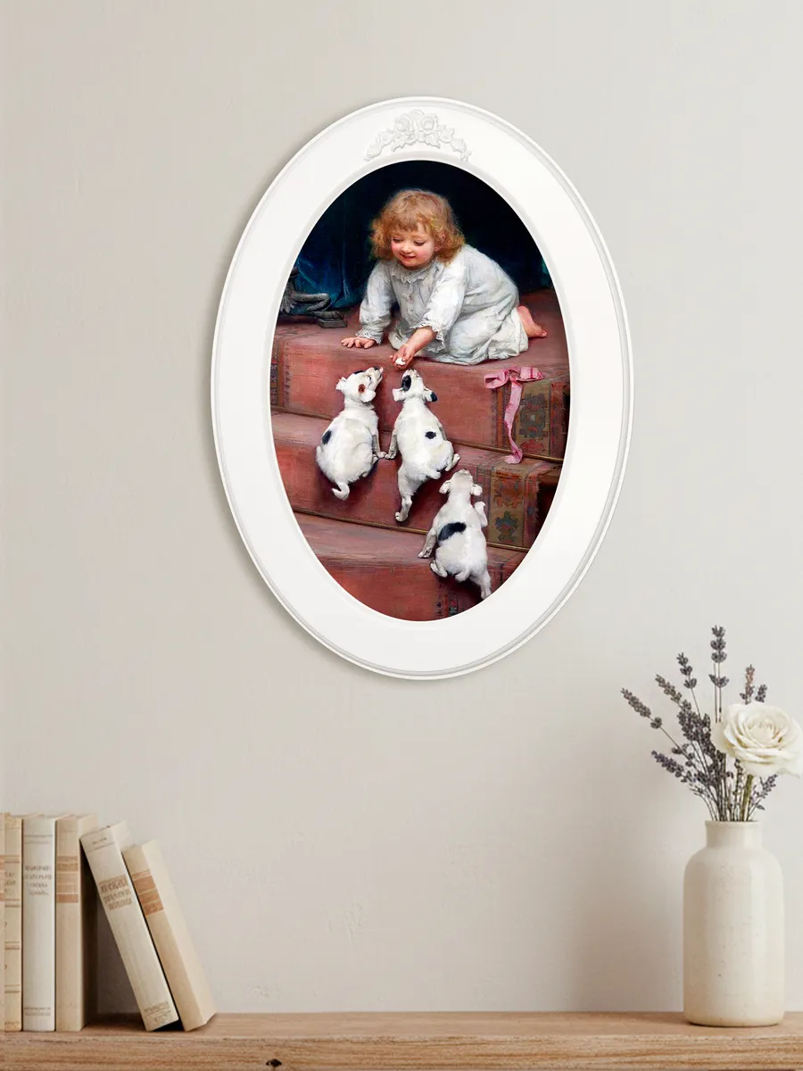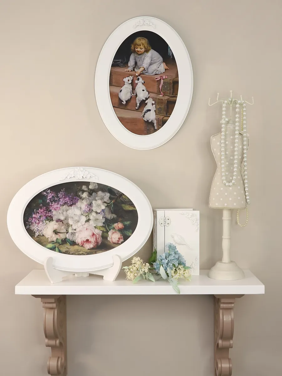 Настенный декор в нежных пастельный тонах. Картина напечатана на натуральном холсте, покрыта матовым лаком, оформлена в овальную белую раму с лепниной.