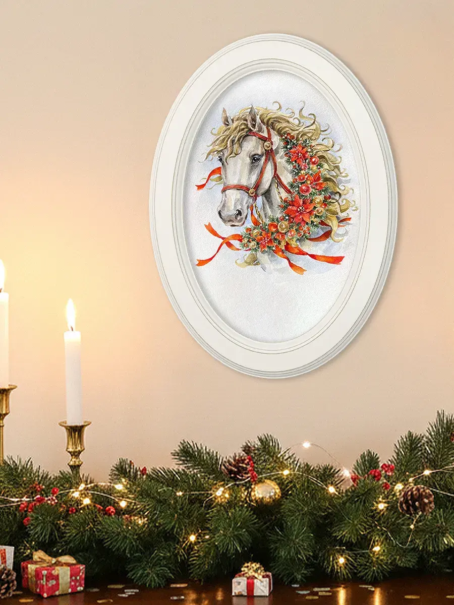 Символ наступающего 2026 года - огненная лошадь. Настенный декор в нежных пастельный тонах. Картина напечатана на натуральном холсте, покрыта матовым лаком, оформлена в овальную белую раму с эффектом состаривания.