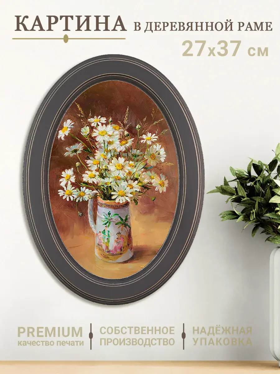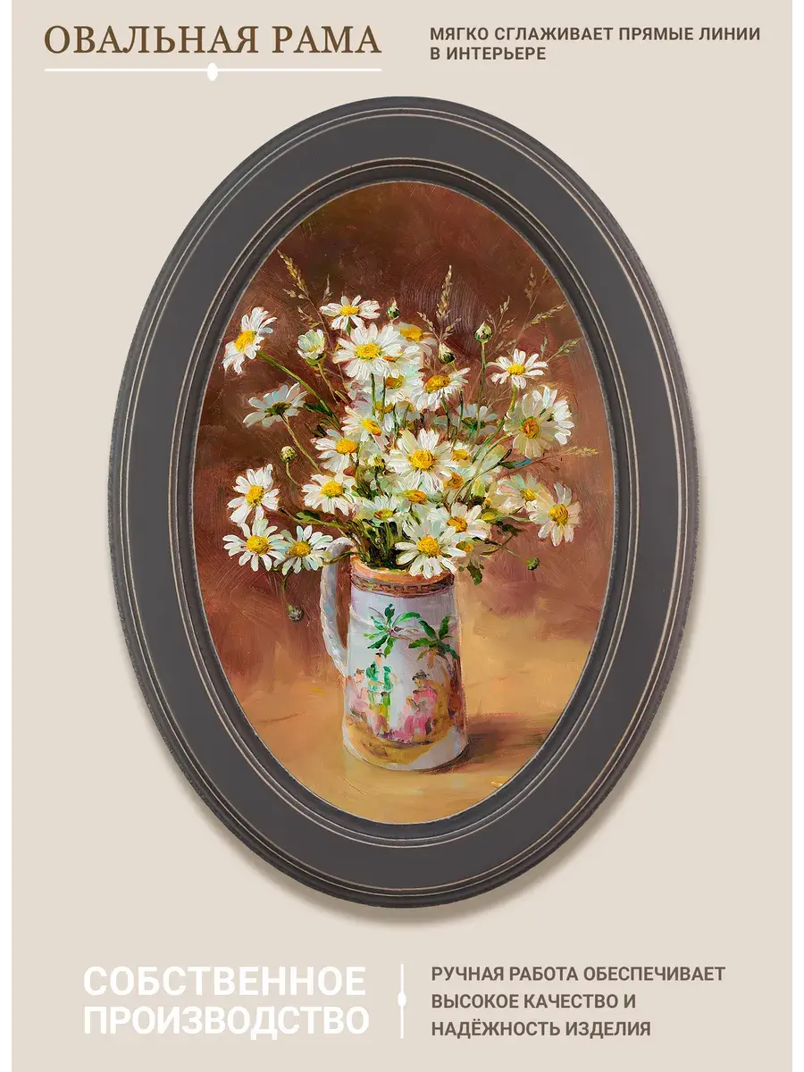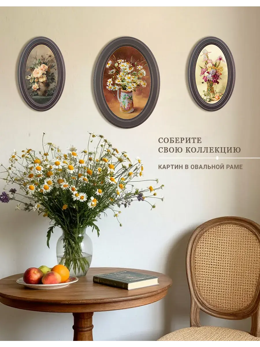 Настенный декор в нежных пастельный тонах. Картина напечатана на натуральном холсте, покрыта матовым лаком, оформлена в овальную коричневую раму с эффектом состаривания.