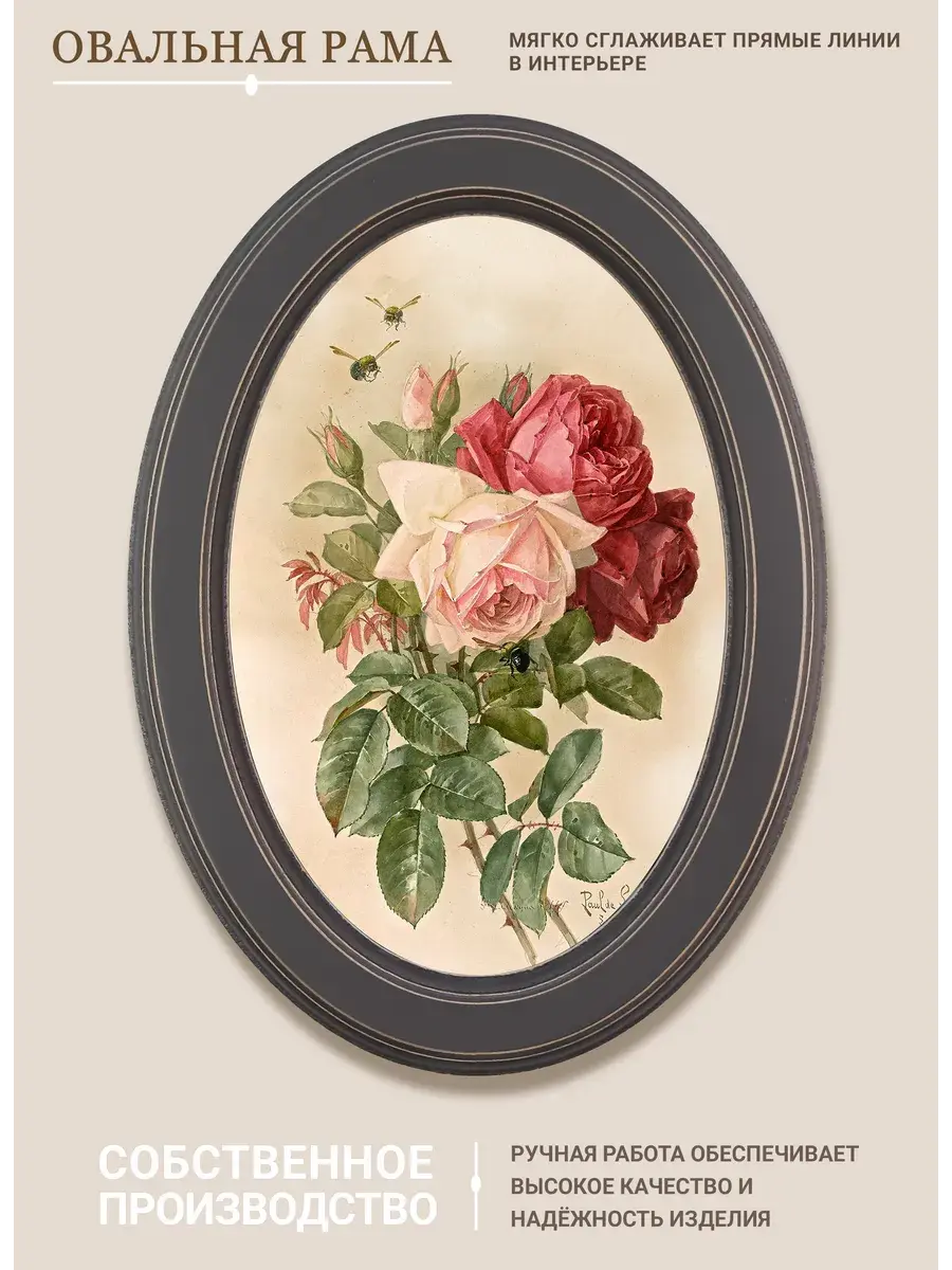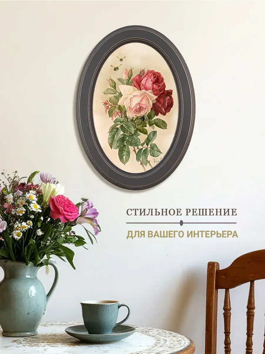 Настенный декор в нежных пастельный тонах. Картина напечатана на натуральном холсте, покрыта матовым лаком, оформлена в овальную коричневую раму с эффектом состаривания.