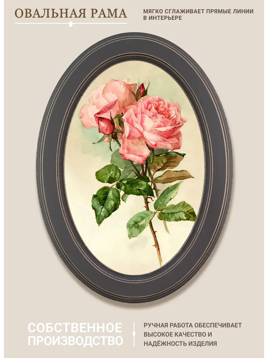 Настенный декор в нежных пастельный тонах. Картина напечатана на натуральном холсте, покрыта матовым лаком, оформлена в овальную коричневую раму с эффектом состаривания.