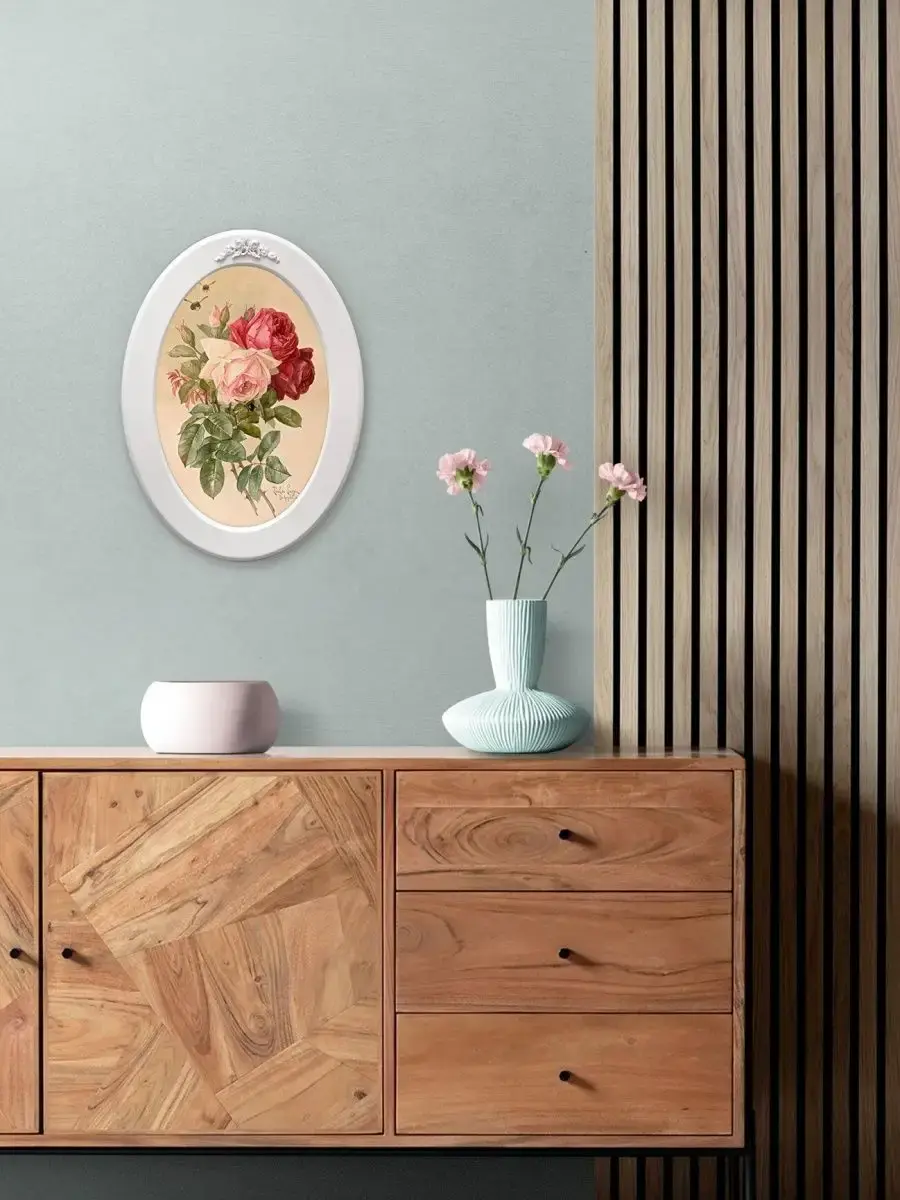 Настенный декор в нежных пастельный тонах. Картина напечатана на натуральном холсте, покрыта матовым лаком оформлена в овальную белую раму с лепниной.