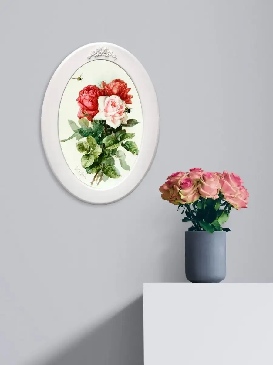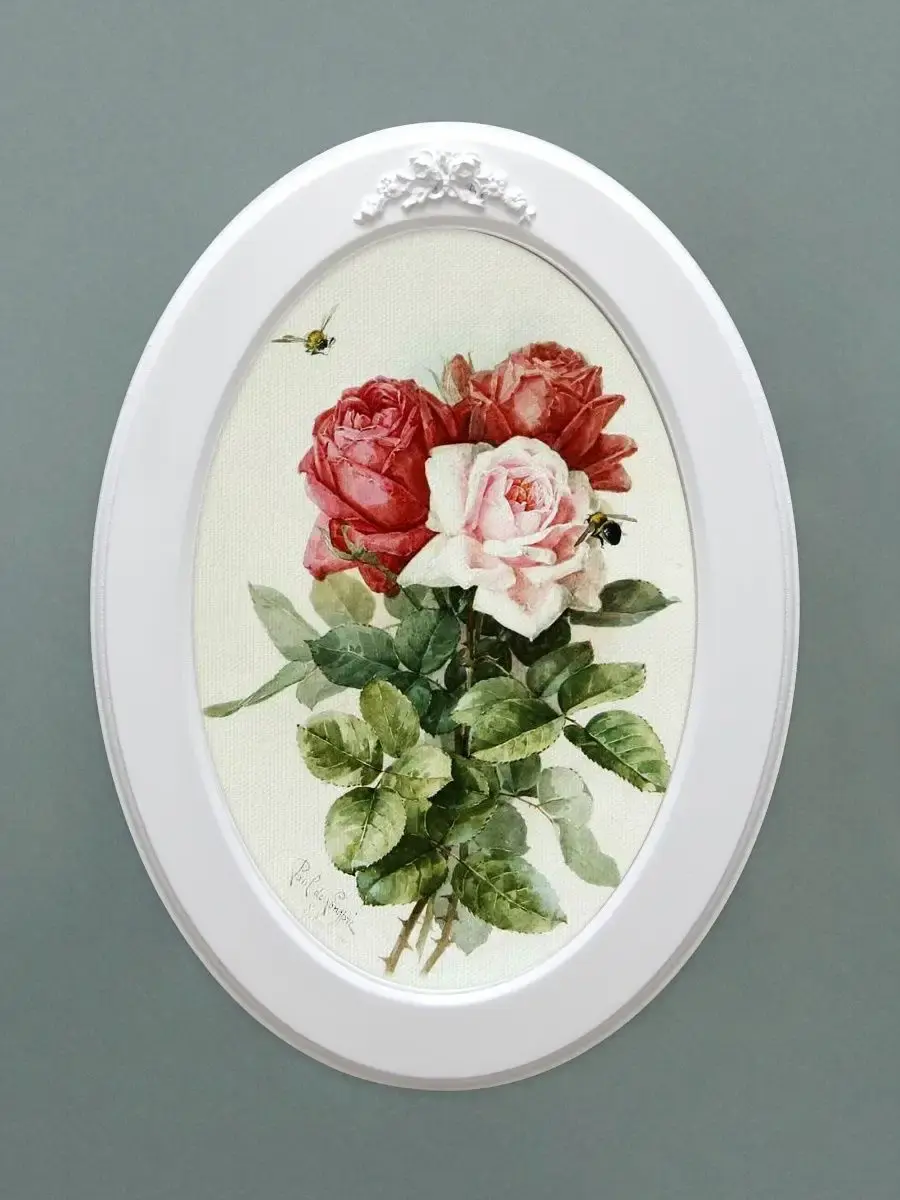 Настенный декор в нежных пастельный тонах. Картина напечатана на натуральном холсте, покрыта матовым лаком оформлена в овальную белую раму с лепниной.