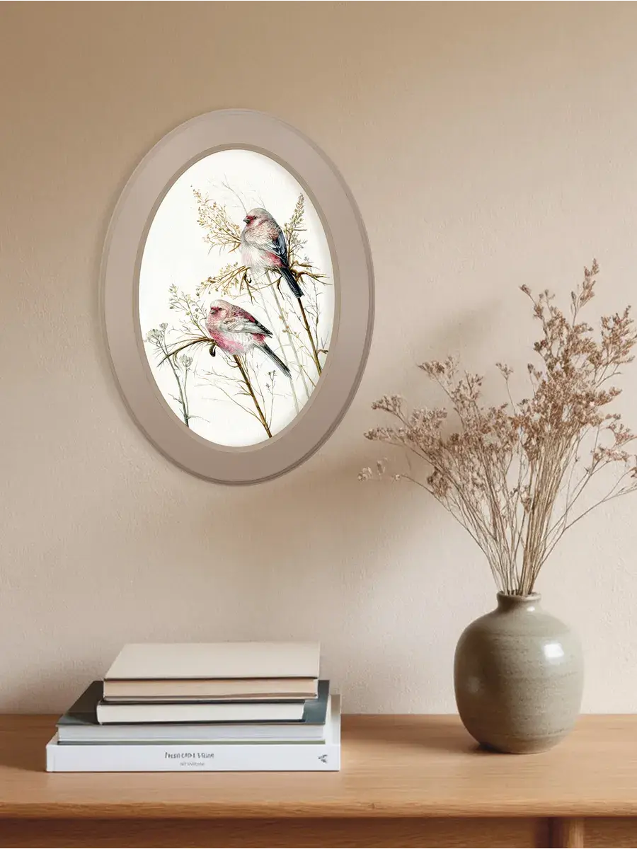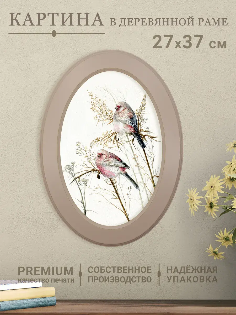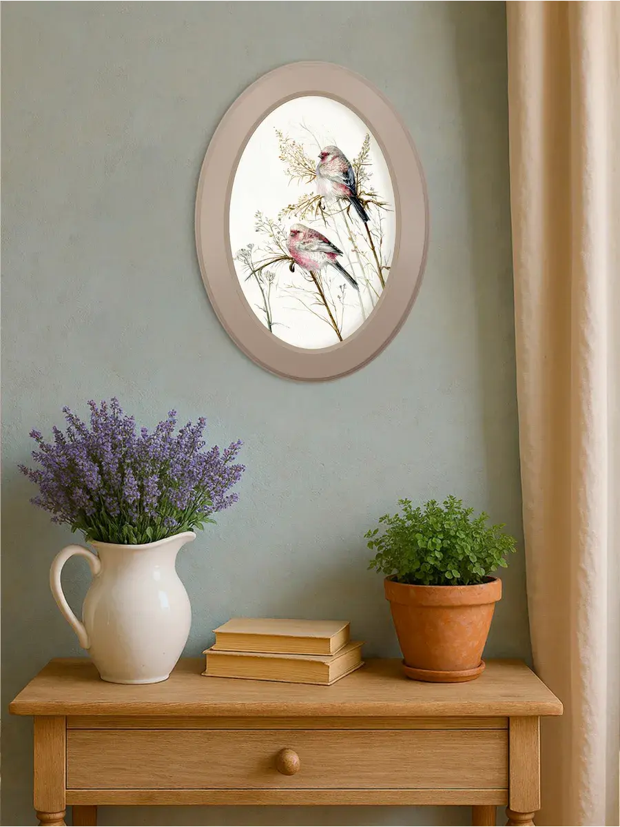 Картина на стену "Прованс" в овальной раме станет изысканным украшением вашего интерьера, наполняя его атмосферой умиротворения и спокойствия. Изображение птичек на натуральном холсте, выполненное в мяткой цветовой палитре, создает ощущение уюта и тепла. Картина в цельной раме из МДФ, что придает ей завершенный и стильный вид. Она станет прекрасным дополнением к любому интерьеру, будь то детская, спальня, прихожая или гостиная. Благодаря своему универсальному дизайну, картина "Прованс" гармонично впишется в любой стиль оформления, привнося в него нотки нежности и элегантности. Размер картины в раме 27*37 см.