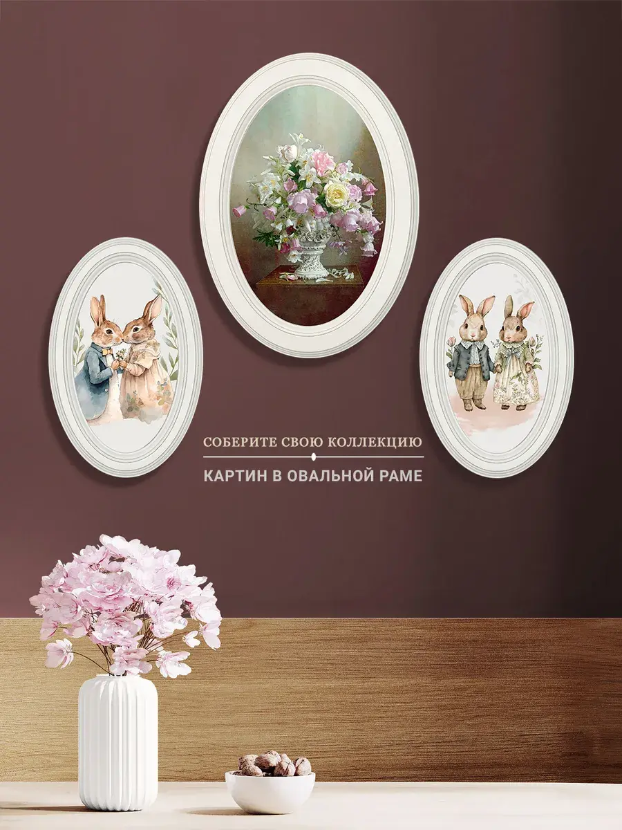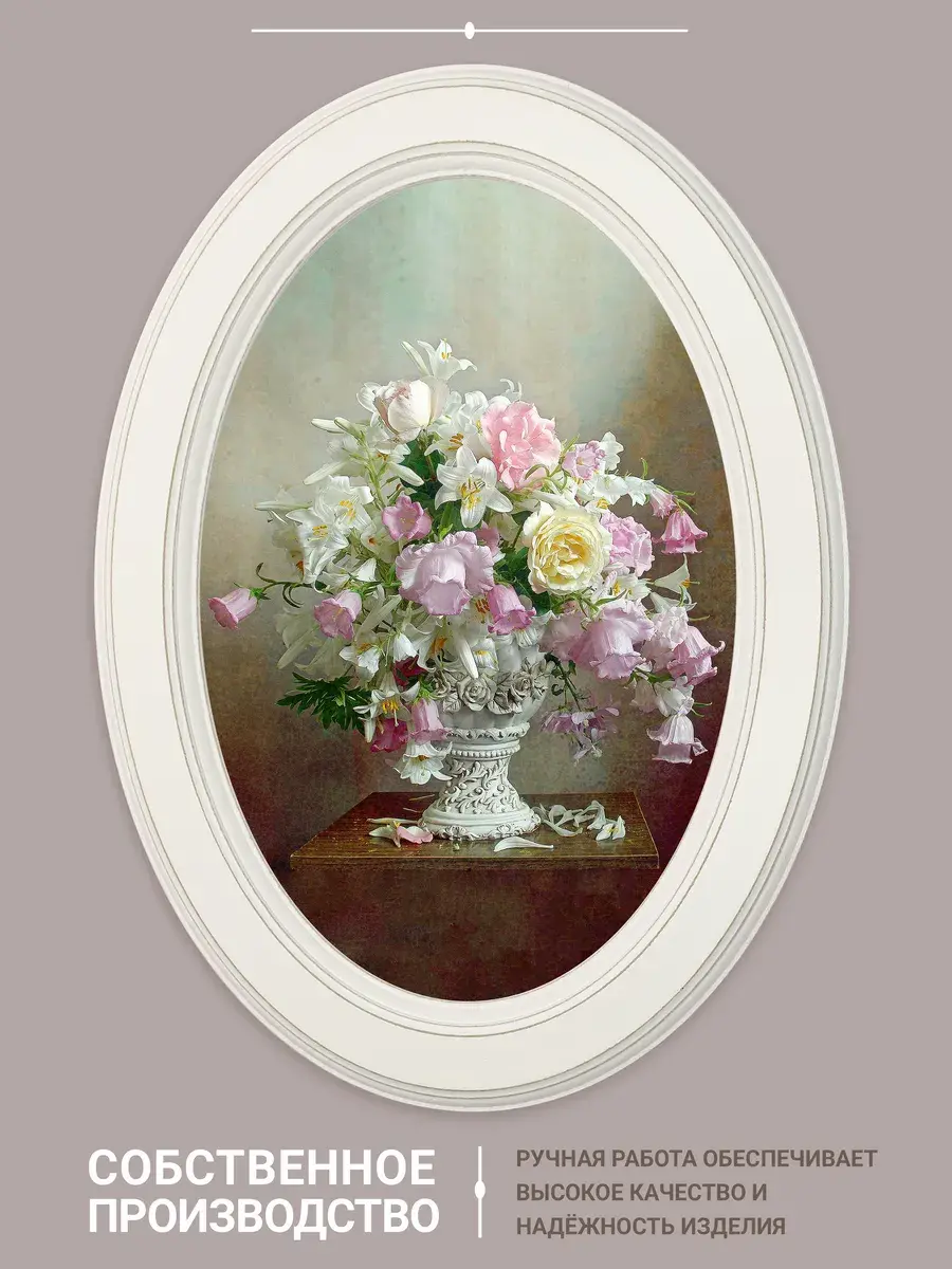 Настенный декор в нежных пастельный тонах. Картина напечатана на натуральном холсте, покрыта матовым лаком, оформлена в овальную белую раму с эффектом состаривания.