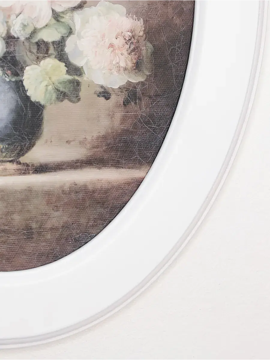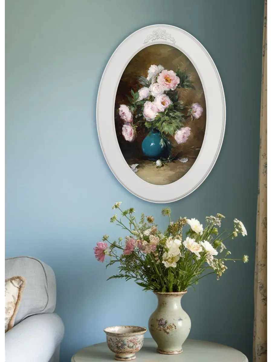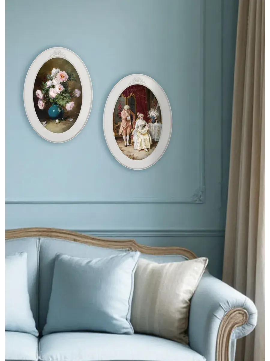 Настенный декор в нежных пастельный тонах. Картина напечатана на натуральном холсте, покрыта матовым лаком, оформлена в овальную белую раму с лепниной.