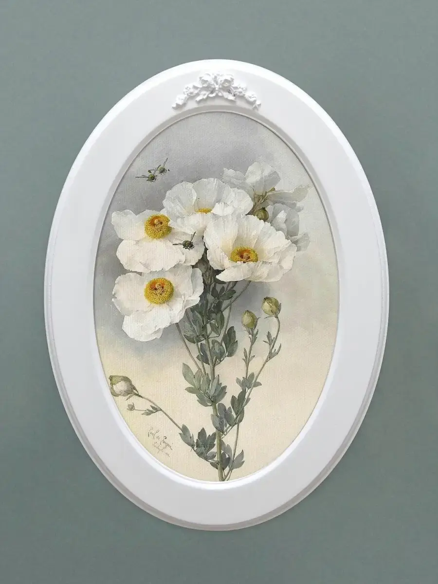 Настенный декор в нежных пастельный тонах. Картина напечатана на натуральном холсте, покрыта матовым лаком оформлена в овальную белую раму с лепниной.