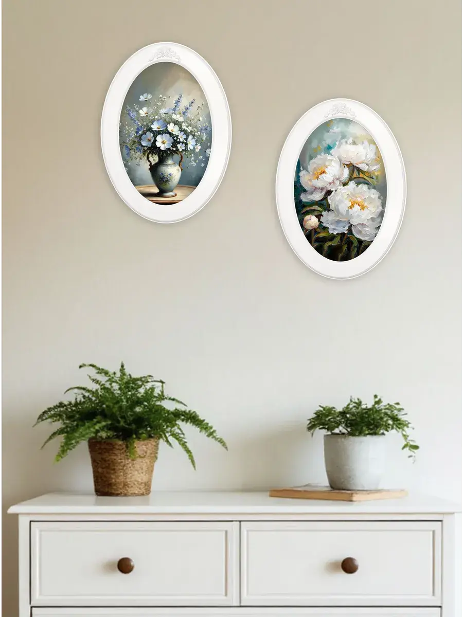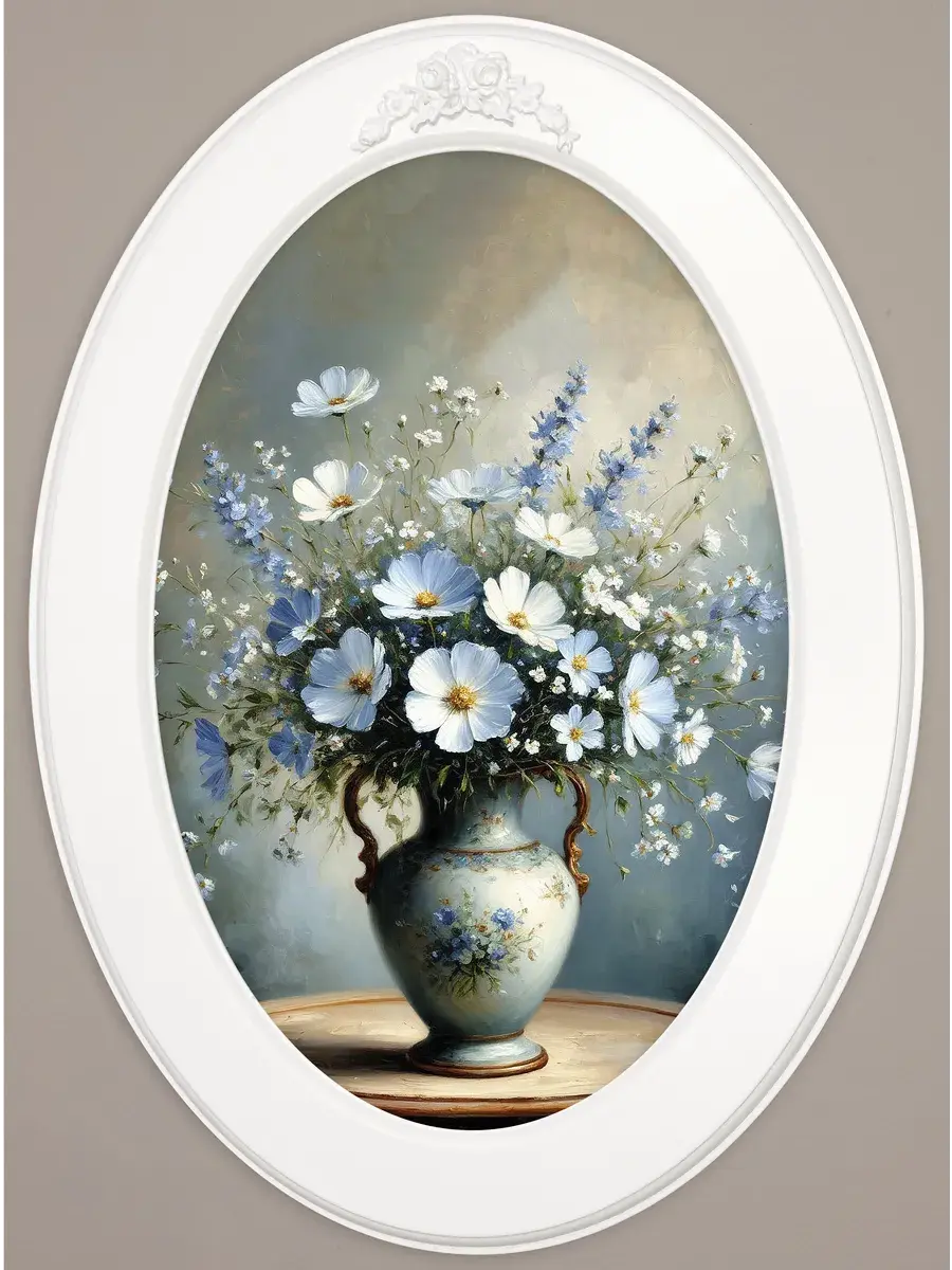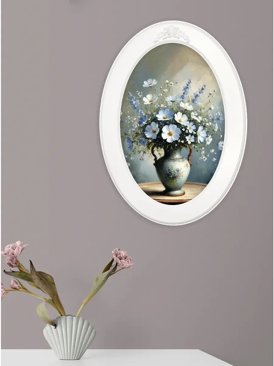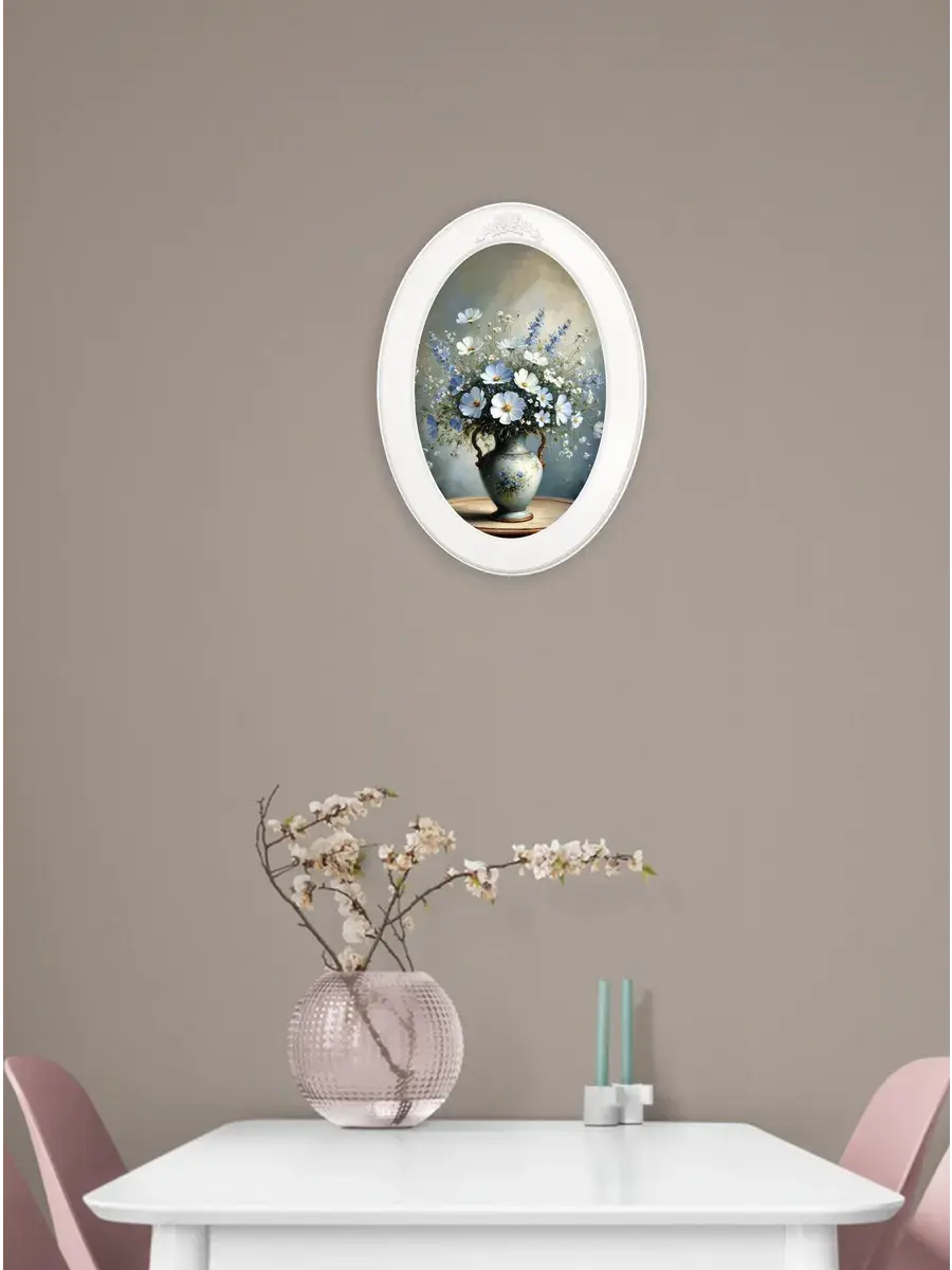 Настенный декор в нежных пастельный тонах. Картина напечатана на натуральном холсте, покрыта матовым лаком, оформлена в овальную белую раму с лепниной.