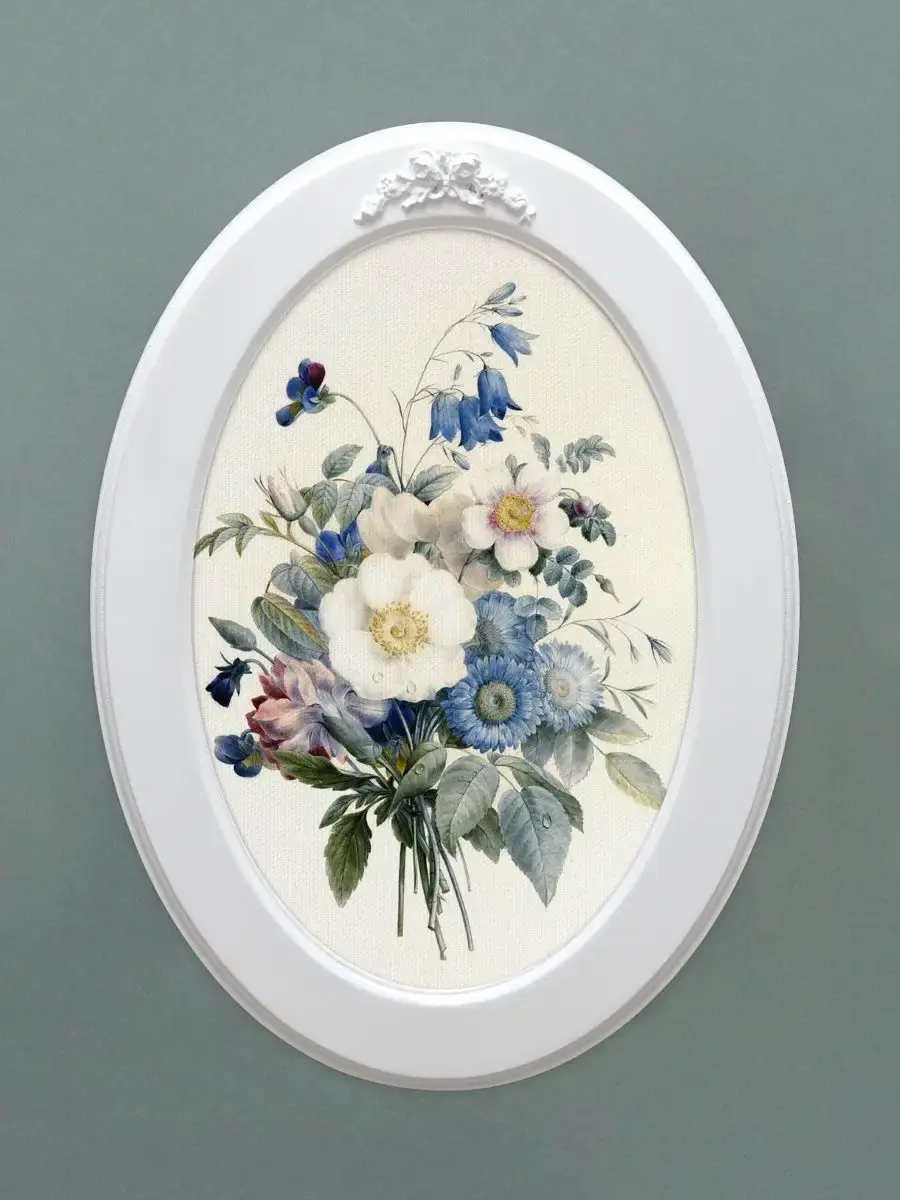 Настенный декор в нежных пастельный тонах. Картина напечатана на натуральном холсте, покрыта матовым лаком оформлена в овальную белую раму с лепниной.