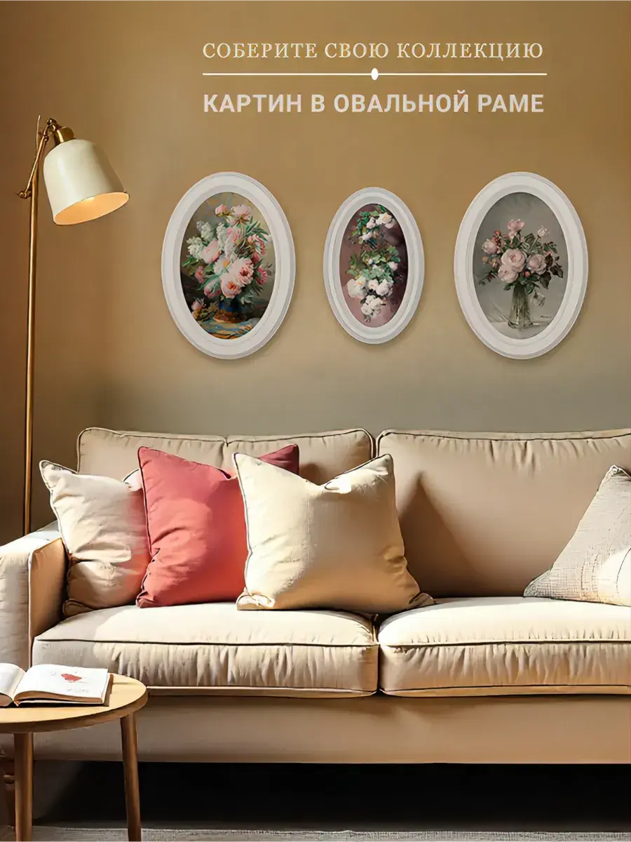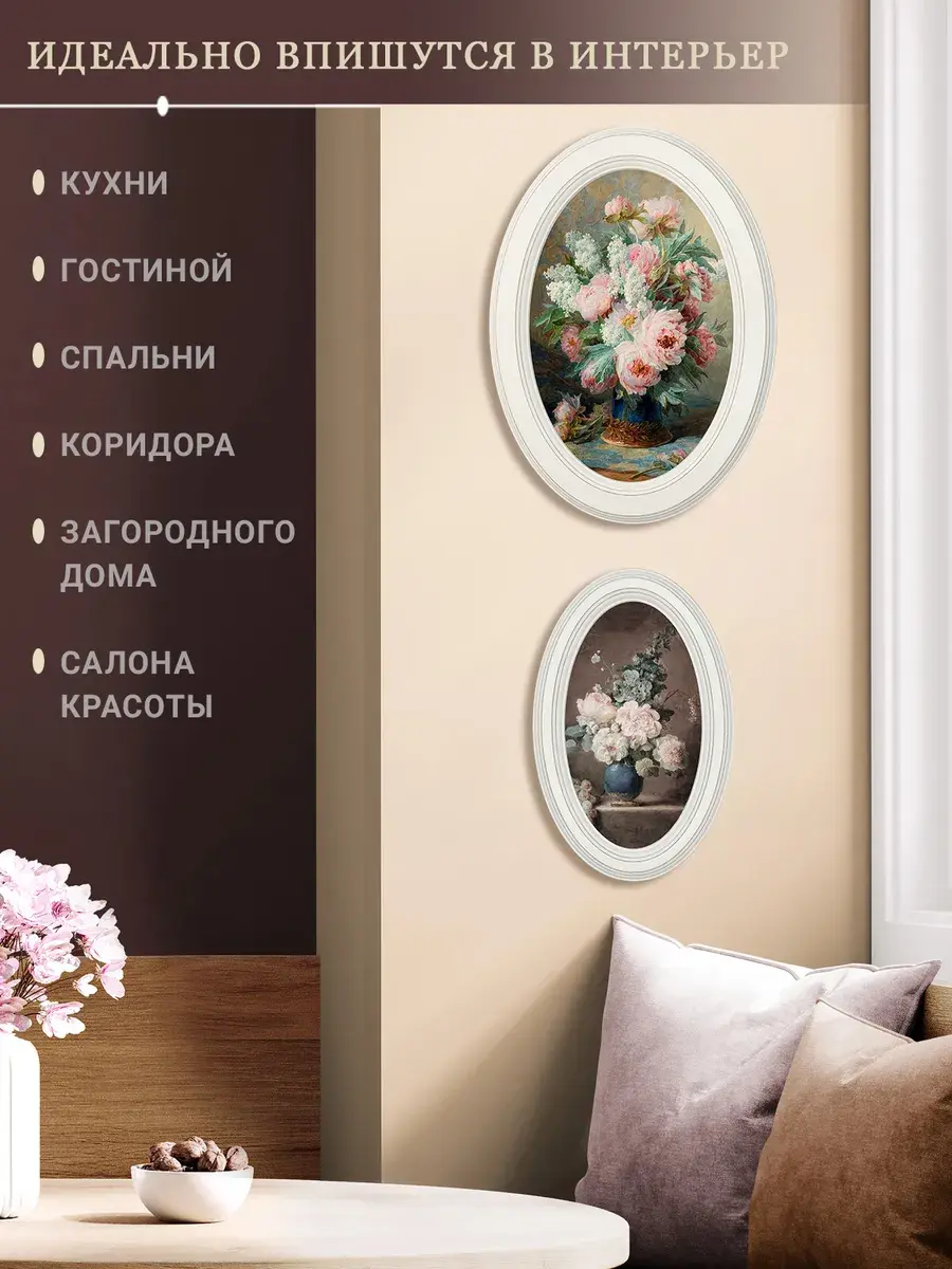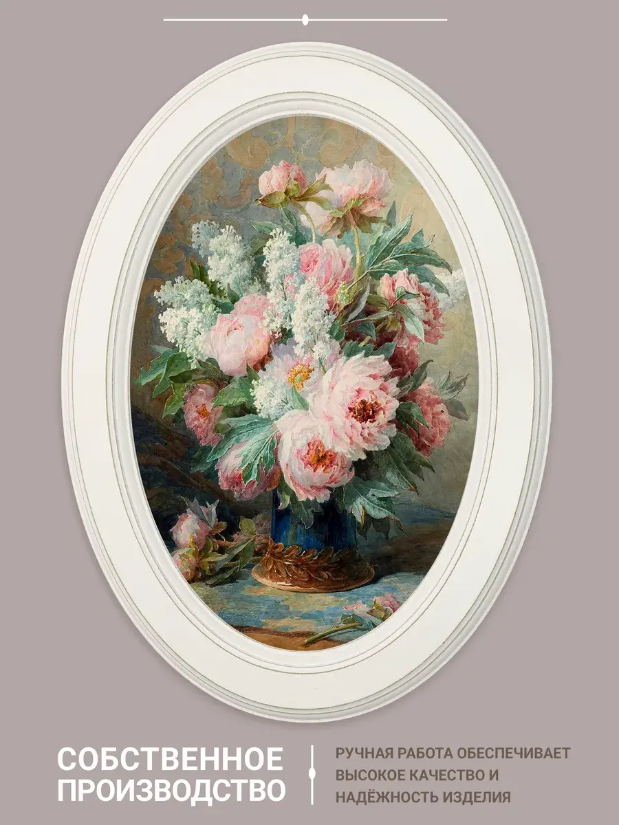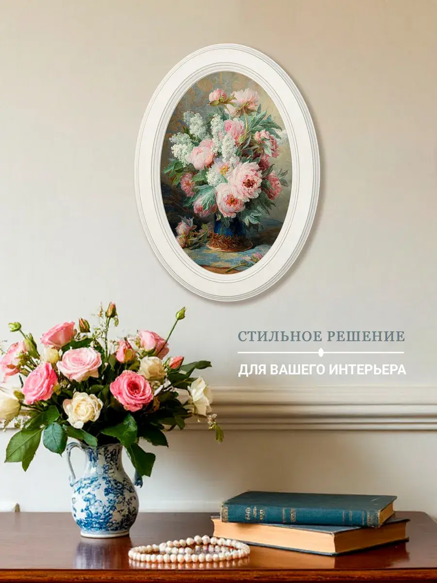Настенный декор в нежных пастельный тонах. Картина напечатана на натуральном холсте, покрыта матовым лаком, оформлена в овальную белую раму с эффектом состаривания.