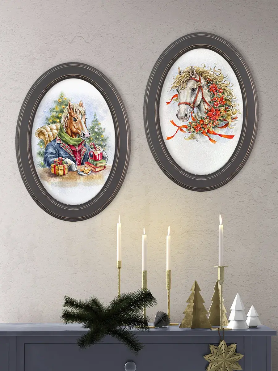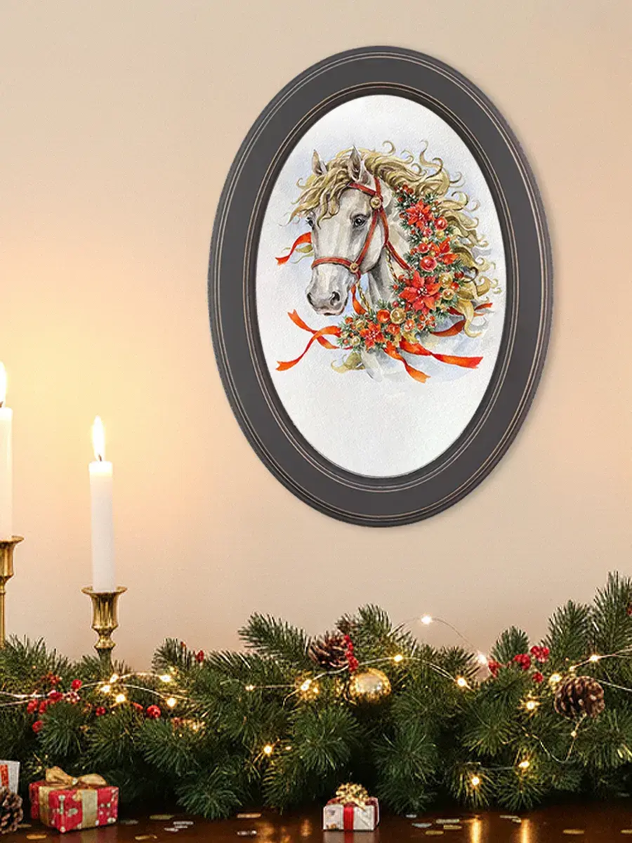 Символ наступающего 2026 года - огненная ошадь. Настенный декор в нежных пастельный тонах. Картина напечатана на натуральном холсте, покрыта матовым лаком, оформлена в овальную коричневую раму с эффектом состаривания.