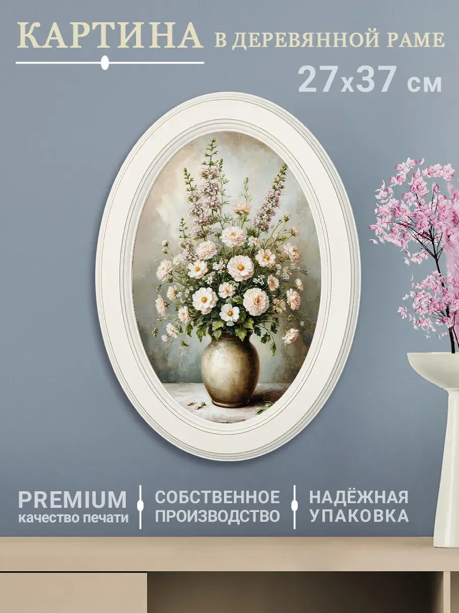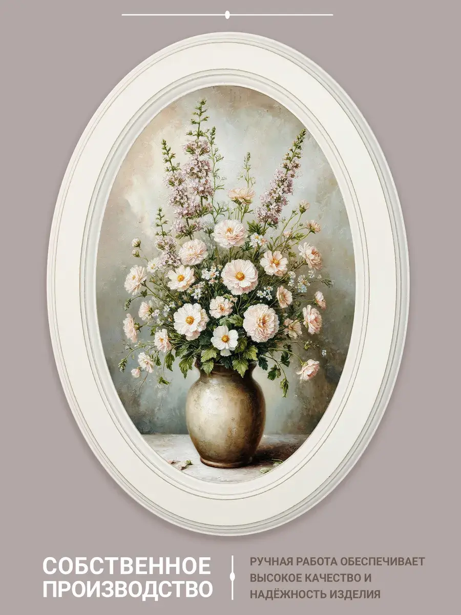 Настенный декор в нежных пастельный тонах. Картина напечатана на натуральном холсте, покрыта матовым лаком, оформлена в овальную белую раму с эффектом состаривания.