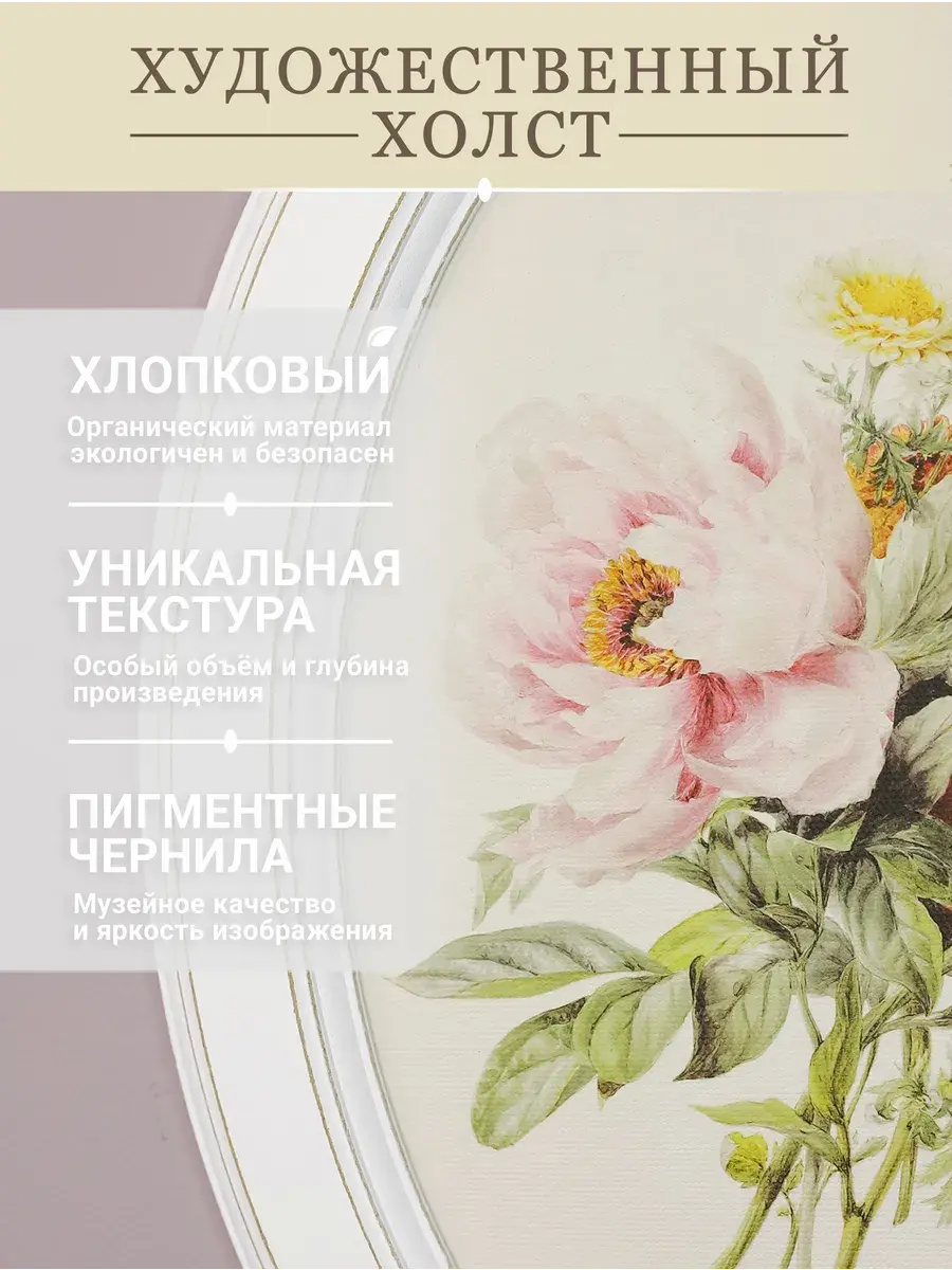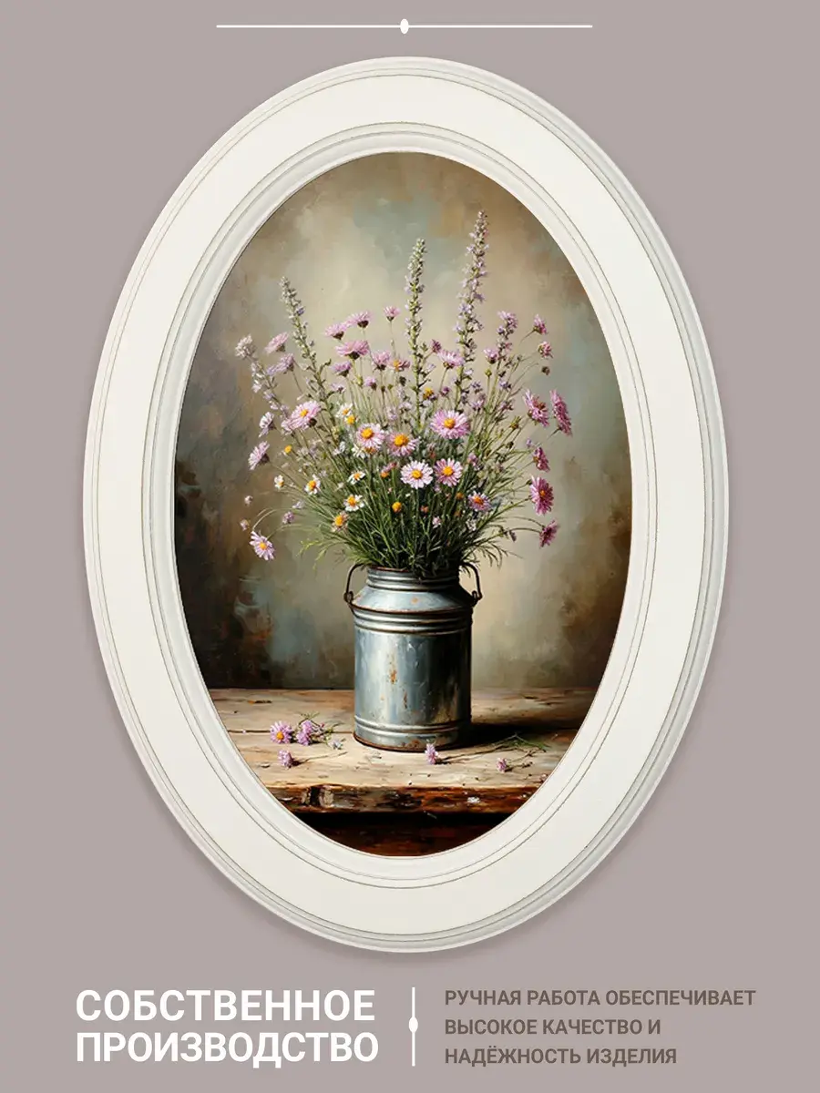 Настенный декор в нежных пастельный тонах. Картина напечатана на натуральном холсте, покрыта матовым лаком, оформлена в овальную белую раму с эффектом состаривания.
