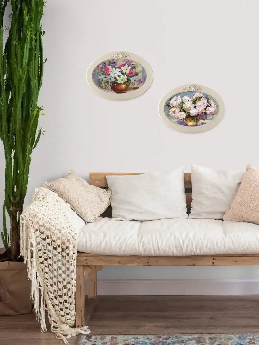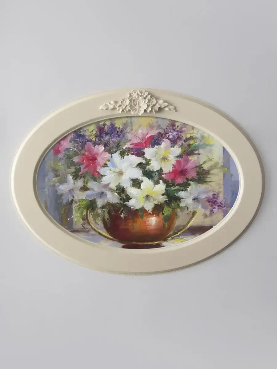 Настенный декор в нежных пастельных тонах. Картина напечатана на натуральном холсте, покрыта матовым лаком в овальной молочной раме с лепниной. Эта картина станет стильным акцентом в вашем интерьере. Она идеально подойдет для оформления стен в различных помещениях: от кухни до спальни, от гостиной до прихожей. Настенное панно выполнено на холсте и отличается яркими цветами, изображающими природу и цветы, что придаст уют и свежесть любому дому или квартире. Декоративное оформление в рамке добавит элегантности и завершенности, делая картину не только предметом декора, но и важной частью атмосферы пространства. Это решение отлично впишется в интерьер офиса, зала или любой комнаты, создавая ощущение счастья и гармонии. Пусть данное предметы искусства придаст вашему дому индивидуальность и изысканный стиль.