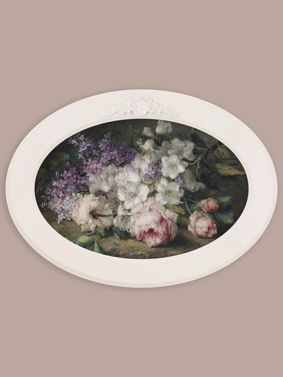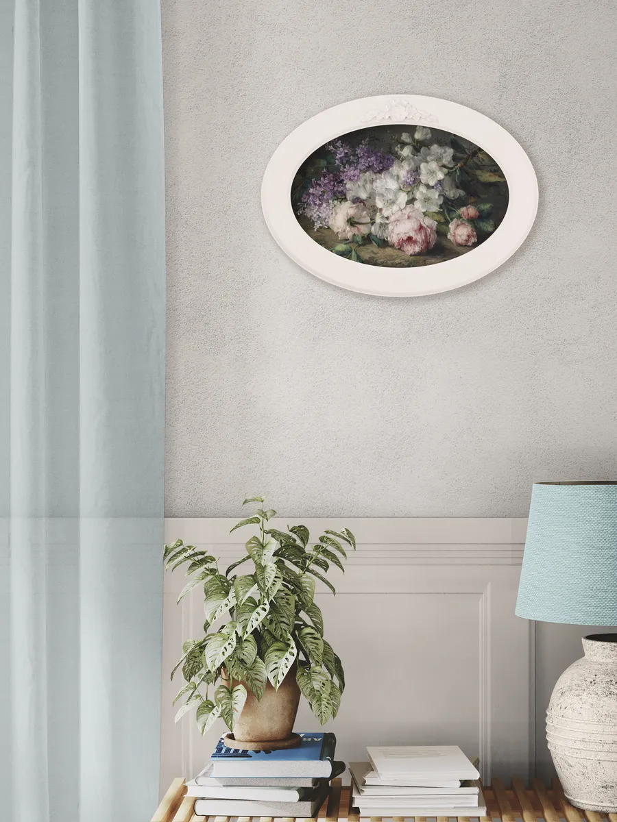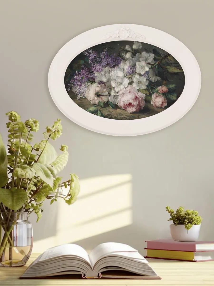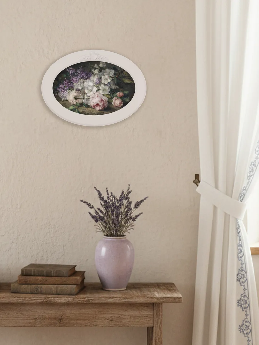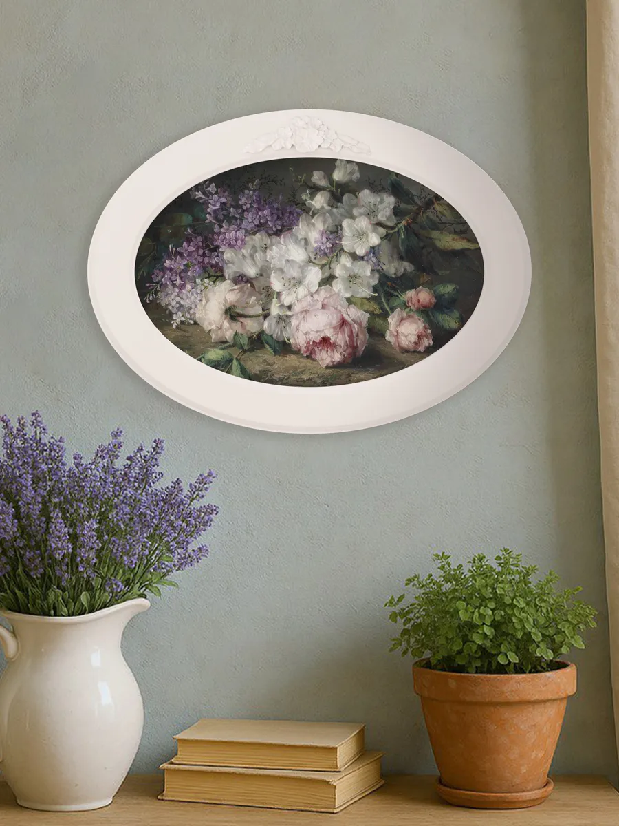 Настенный декор в нежных пастельных тонах. Картина напечатана на натуральном холсте, покрыта матовым лаком в овальной молочной раме с лепниной. Эта картина станет стильным акцентом в вашем интерьере. Она идеально подойдет для оформления стен в различных помещениях: от кухни до спальни, от гостиной до прихожей. Настенное панно выполнено на холсте и отличается яркими цветами, изображающими природу и цветы, что придаст уют и свежесть любому дому или квартире. Декоративное оформление в рамке добавит элегантности и завершенности, делая картину не только предметом декора, но и важной частью атмосферы пространства. Это решение отлично впишется в интерьер офиса, зала или любой комнаты, создавая ощущение счастья и гармонии. Пусть данное предметы искусства придаст вашему дому индивидуальность и изысканный стиль.