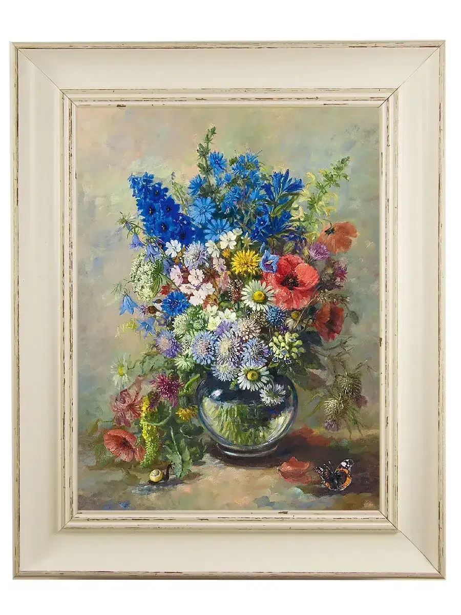 Картина в стиле прованс с нежной цветочной композицией станет прекрасным украшением интерьера квартиры, дачи или загородного дома. Интерьерная картина имитирует масляную живопись, идеально впишется в дизайн спальни, гостиной, кухни, прихожей и других помещений. Репродукция выполнена высококачественной печатью, устойчивой к выцветанию, на натуральном холсте, покрыта лаком без запаха. Винтажная матовая рама для картины белая с эффектом старения, изготовлена из полиуретана. Картина в раме - актуальный во все времена элемент декора, который придает интерьеру статусность, уют и привносит особую атмосферу в пространство. Поэтому картина, оформленная в багет - отличный подарок близкому человеку на любое событие: день рождения, новый год, 8 марта, годовщина свадьбы и т.д. Внешний размер картины 36 на 29 см.