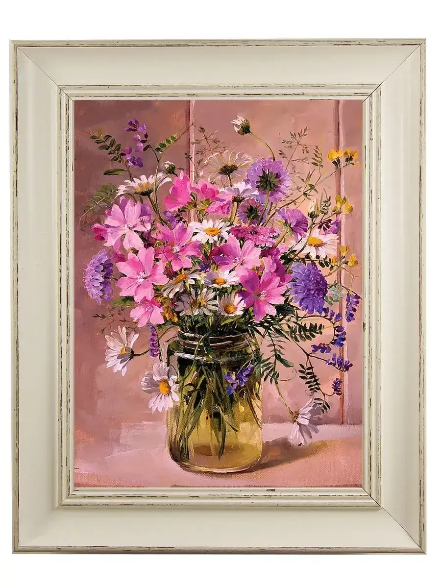 Картина в стиле прованс с нежной цветочной композицией станет прекрасным украшением интерьера квартиры, дачи или загородного дома. Интерьерная картина имитирует масляную живопись, идеально впишется в дизайн спальни, гостиной, кухни, прихожей и других помещений. Репродукция выполнена высококачественной печатью, устойчивой к выцветанию, на натуральном холсте, покрыта лаком без запаха. Винтажная матовая рама для картины белая с эффектом старения, изготовлена из полиуретана. Картина в раме - актуальный во все времена элемент декора, который придает интерьеру статусность, уют и привносит особую атмосферу в пространство. Поэтому картина, оформленная в багет - отличный подарок близкому человеку на любое событие: день рождения, новый год, 8 марта, годовщина свадьбы и т.д. Внешний размер картины 36 на 29 см.