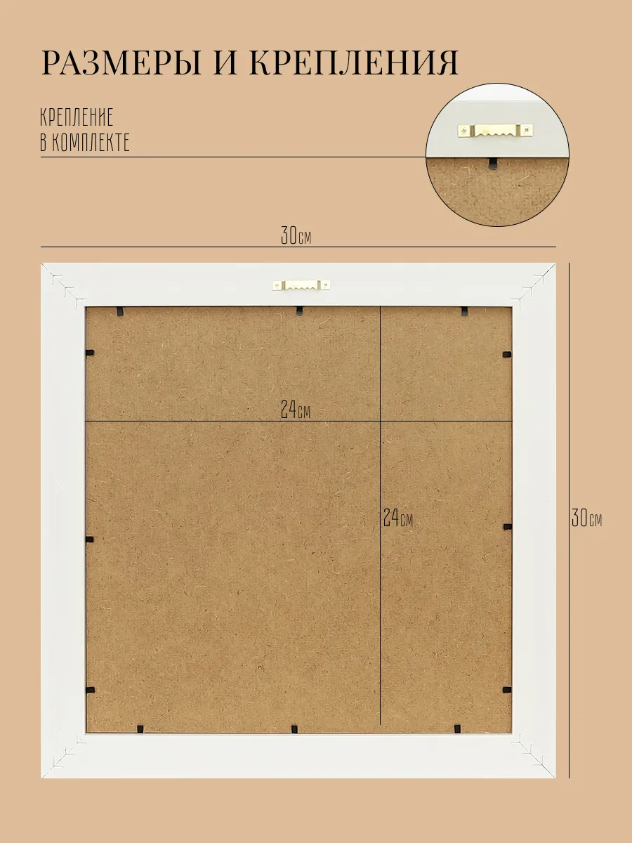 Картина выполнена высококачественной печатью, устойчивой к выцветанию, на натуральном холсте, покрыта лаком без запаха. Размер картины в раме 30*30 см, размер холста 24*24 см.