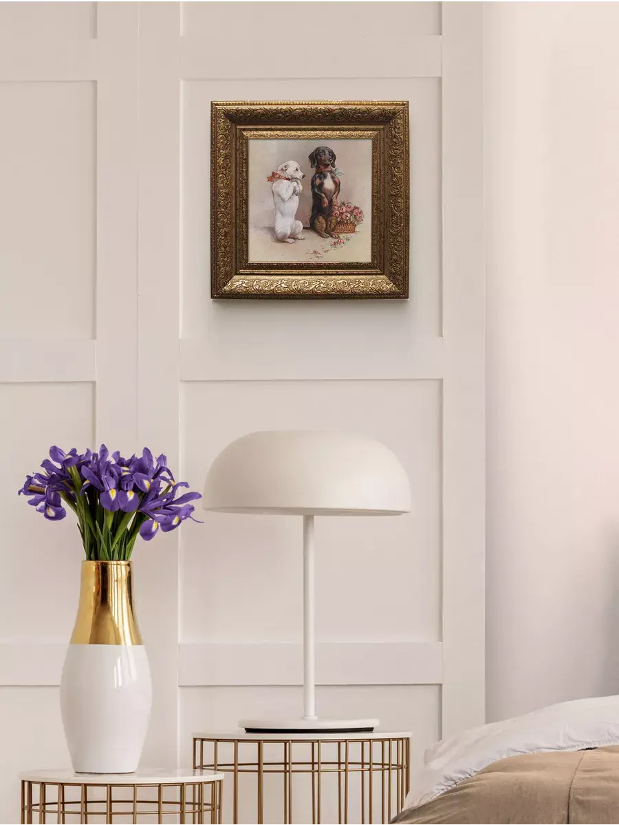 Картина художника Эдуарда Мане Кинг Чарльза с изображением собак для создания коллекций в классическом стиле. Украшение для стен дома, гостиной, прихожей, спальни, детской, оформления кабинетана, для создания уютной атмосферы на даче. Картины в золотой классической раме подойдет для оформления стен в кафе и ресторане. Картина напечатана на натуральном холсте, покрыта лаком. Для защиты от провисания холст наклеен на хдф. Рама широкая из полиуретана, матовая с эффектом старения. Размера холст 20*20 см. Ширина рамы 5,5 см. Картина - это отличный подарок. Крепление для стены в комплекте.