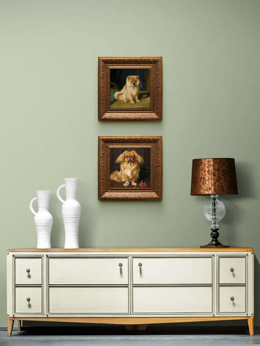 Картина художника Эдуарда Мане Кинг Чарльза с изображением собак для создания коллекций в классическом стиле. Украшение для стен дома, гостиной, прихожей, спальни, детской, оформления кабинетана, для создания уютной атмосферы на даче. Картины в золотой классической раме подойдет для оформления стен в кафе и ресторане. Картина напечатана на натуральном холсте, покрыта лаком. Для защиты от провисания холст наклеен на хдф. Рама широкая из полиуретана, матовая с эффектом старения. Размера холст 20*20 см. Ширина рамы 5,5 см. Картина - это отличный подарок. Крепление для стены в комплекте.