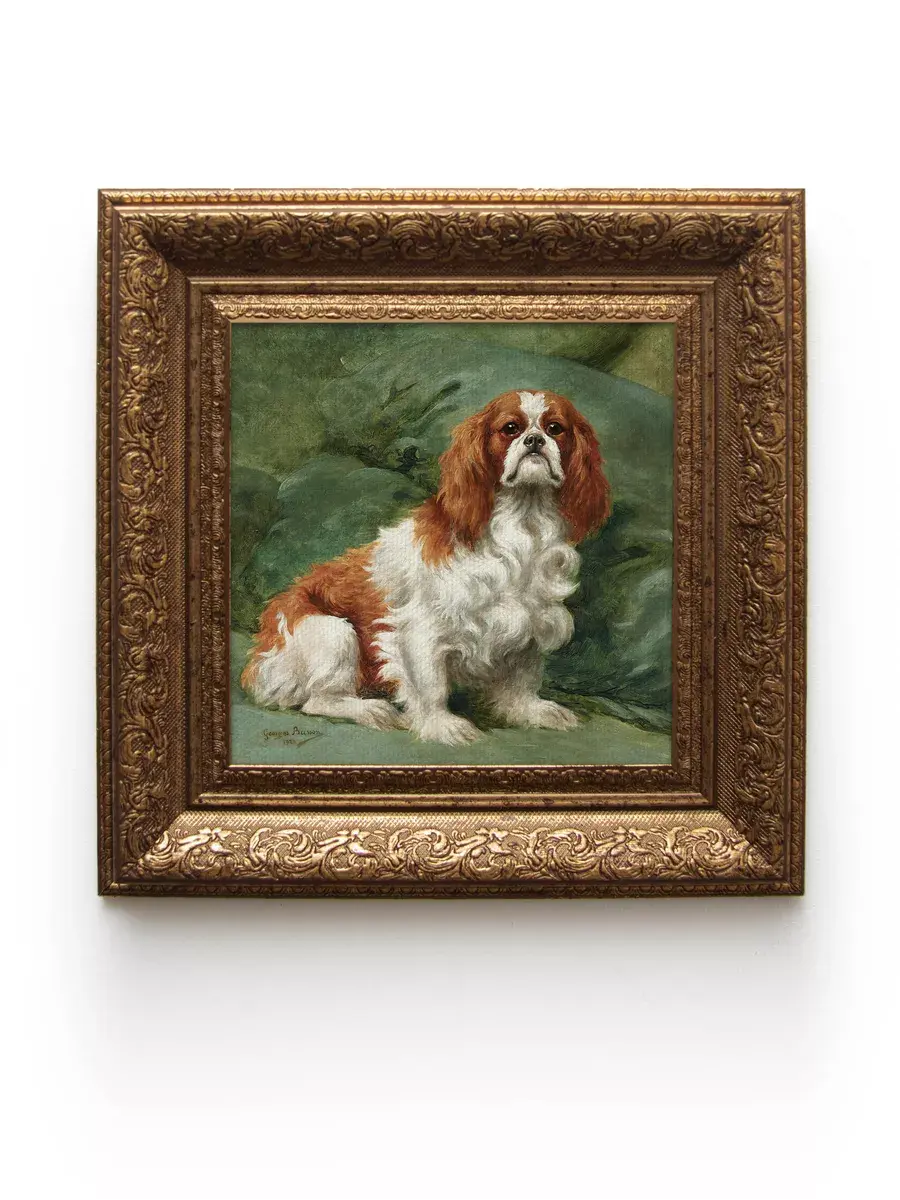 Картина художника Эдуарда Мане Кинг Чарльза с изображением собак для создания коллекций в классическом стиле. Украшение для стен дома, гостиной, прихожей, спальни, детской, оформления кабинетана, для создания уютной атмосферы на даче. Картины в золотой классической раме подойдет для оформления стен в кафе и ресторане. Картина напечатана на натуральном холсте, покрыта лаком. Для защиты от провисания холст наклеен на хдф. Рама широкая из полиуретана, матовая с эффектом старения. Размера холст 20*20 см. Ширина рамы 5,5 см. Картина - это отличный подарок. Крепление для стены в комплекте.