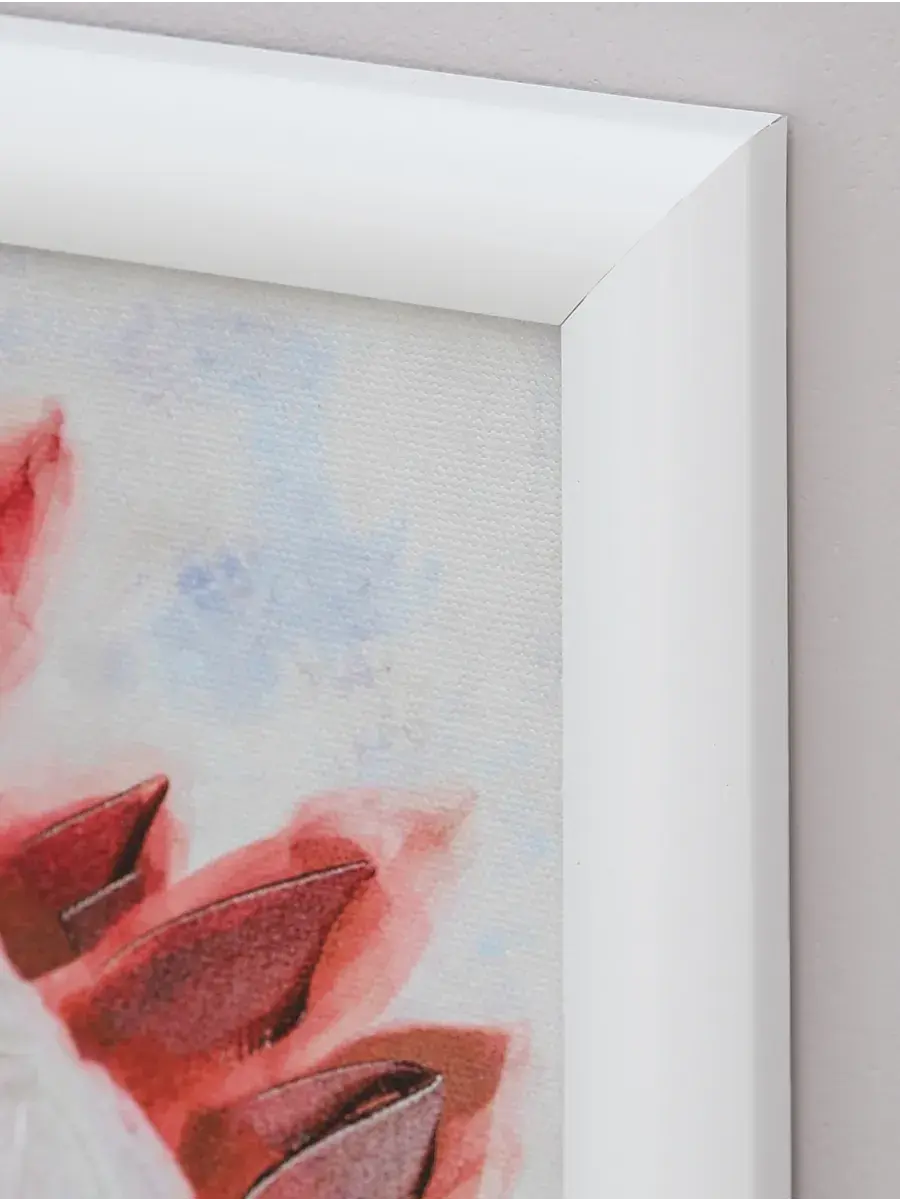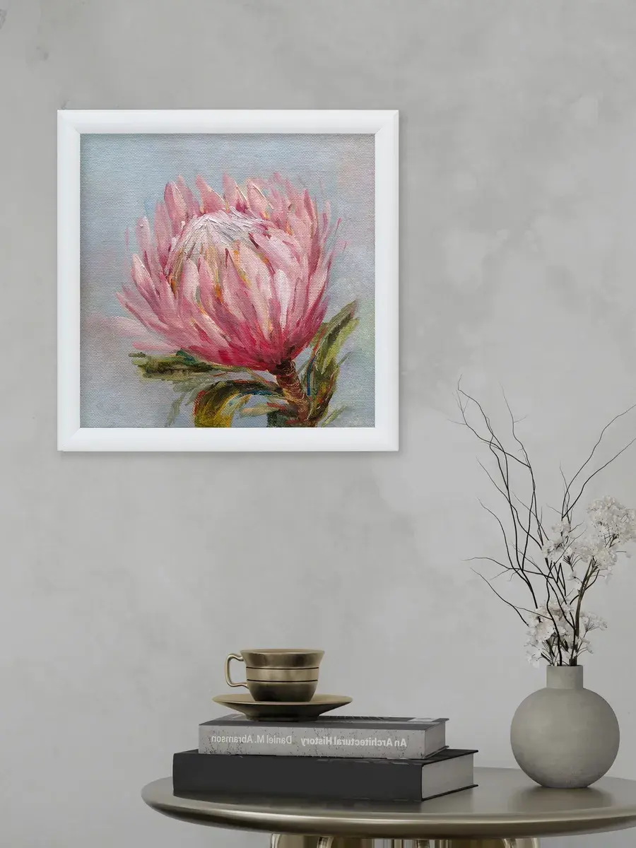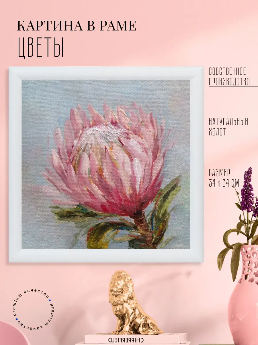 Картина напечатана на натуральном холсте, покрыта лаком. Тонкая белая багетная рама по периметру. Размер картины с рамой 32*32 см.