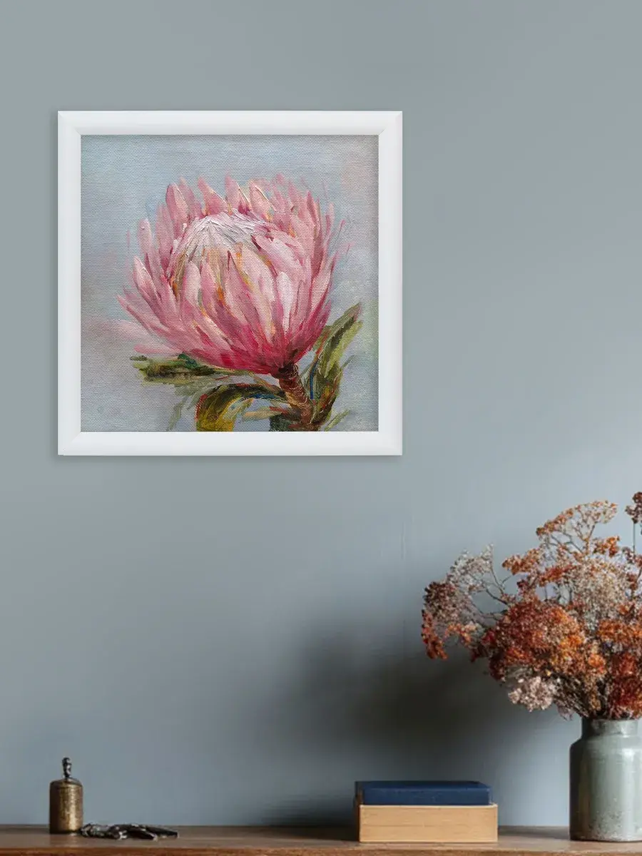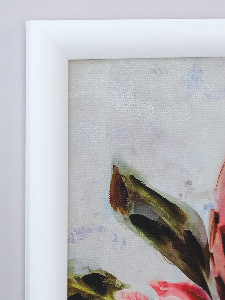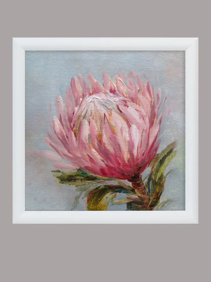Картина напечатана на натуральном холсте, покрыта лаком. Тонкая белая багетная рама по периметру. Размер картины с рамой 32*32 см.
