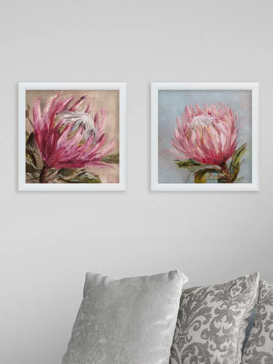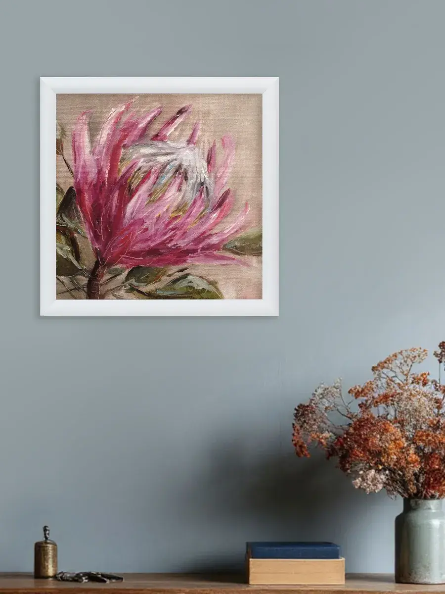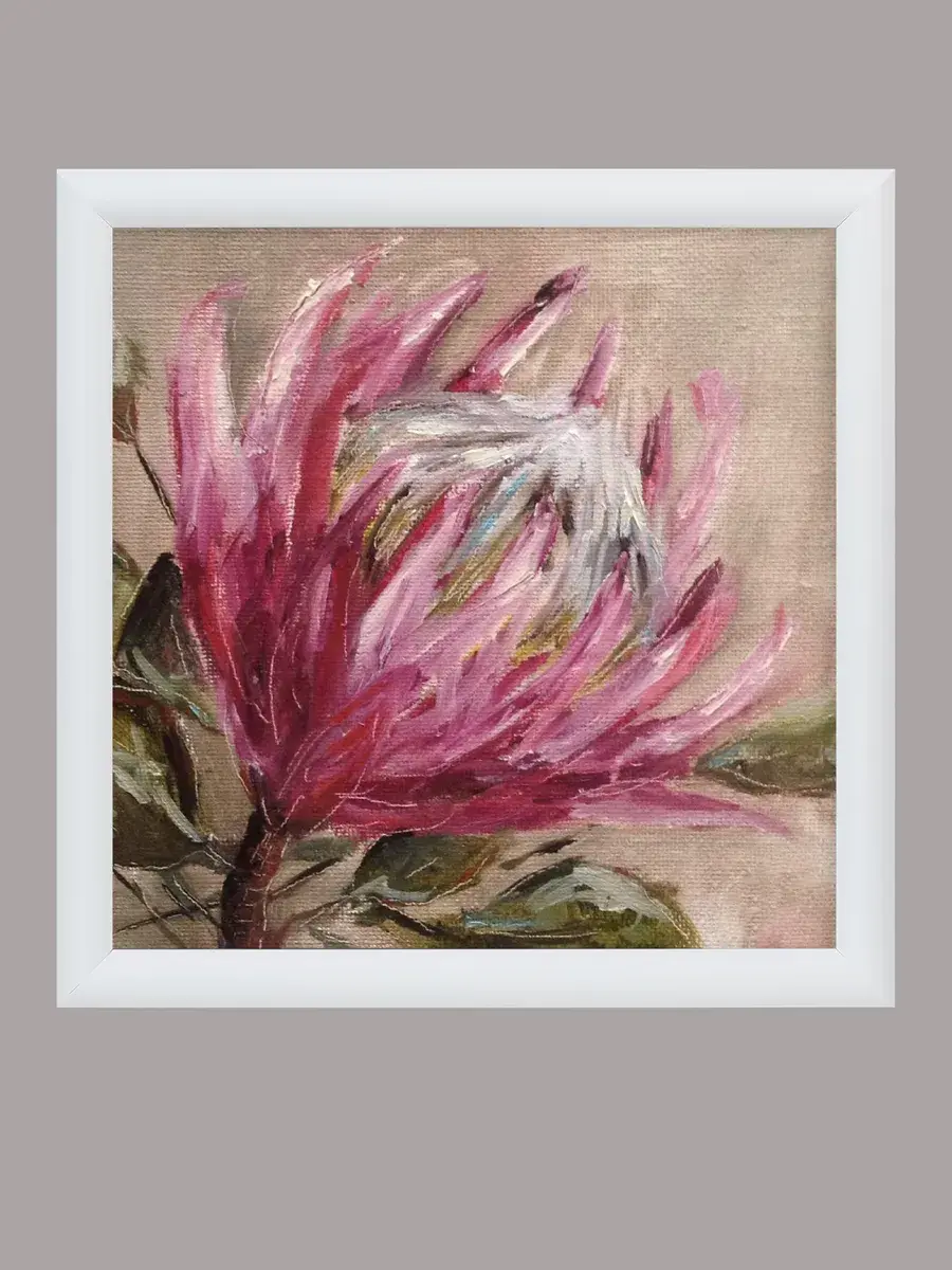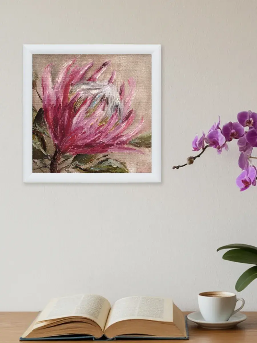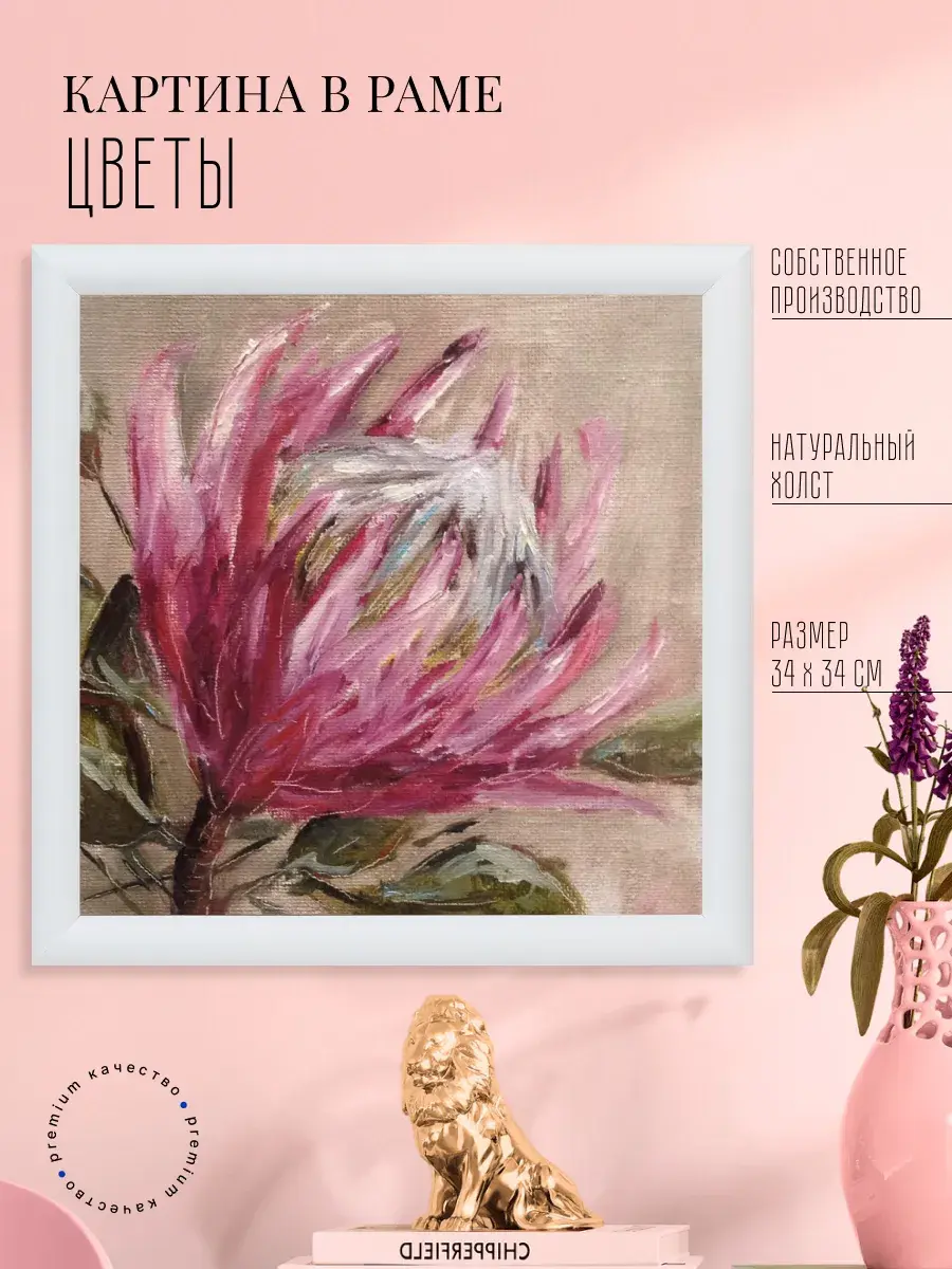 Картина напечатана на натуральном холсте, покрыта лаком. Тонкая белая багетная рама по периметру. Размер картины с рамой 32*32 см.