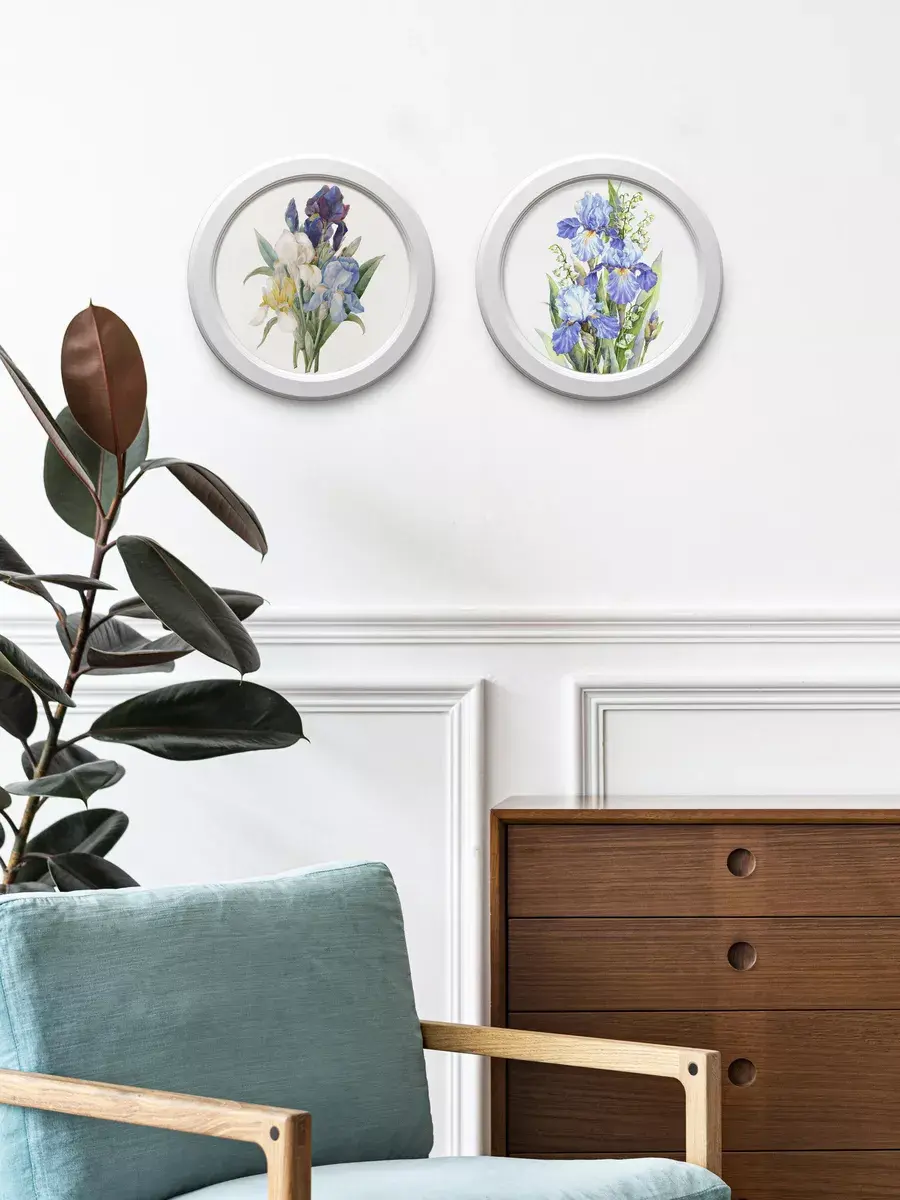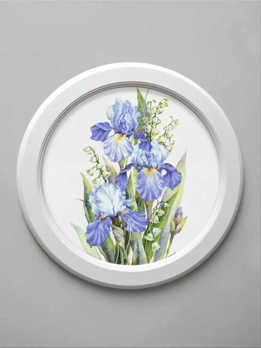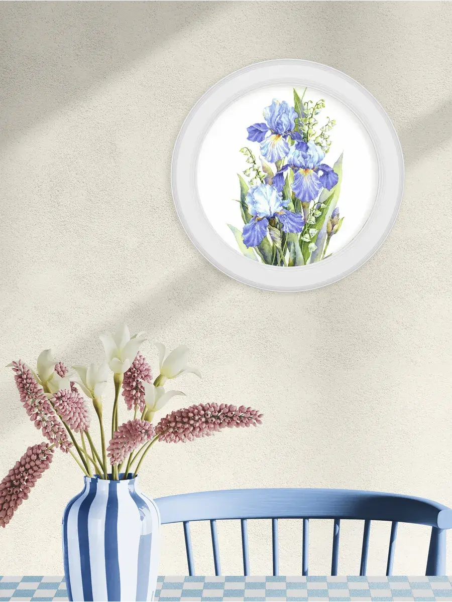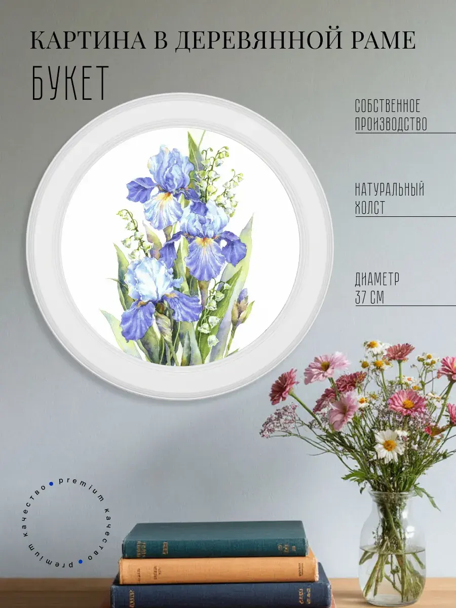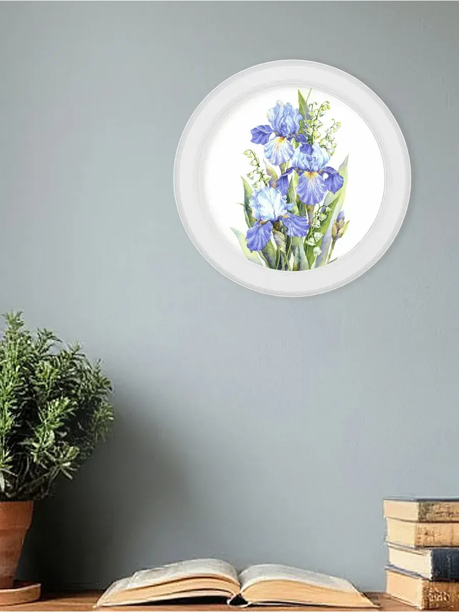 Декор на стену с голубыми ирисами в нежных пастельных тонах в белой раме. Картина на стену напечатана на натуральном холсте, покрыта матовым лаком в круглой раме станет прекрасным украшением интерьера. Множество вариантов дает возможность создать собственную коллекцию. Украшать стены можно дополняя коллекцию. Рама изготовлена из цельного листа МДФ 16 мм, не имеет зазоров и стыков. Окрашена экологичной акриловой эмалью на водной основе. Диаметр картины 37 см, диаметр изображения 29 см. Крепление для стены в комплекте.