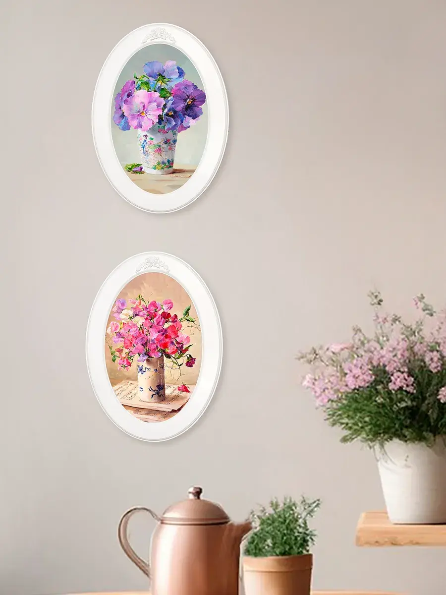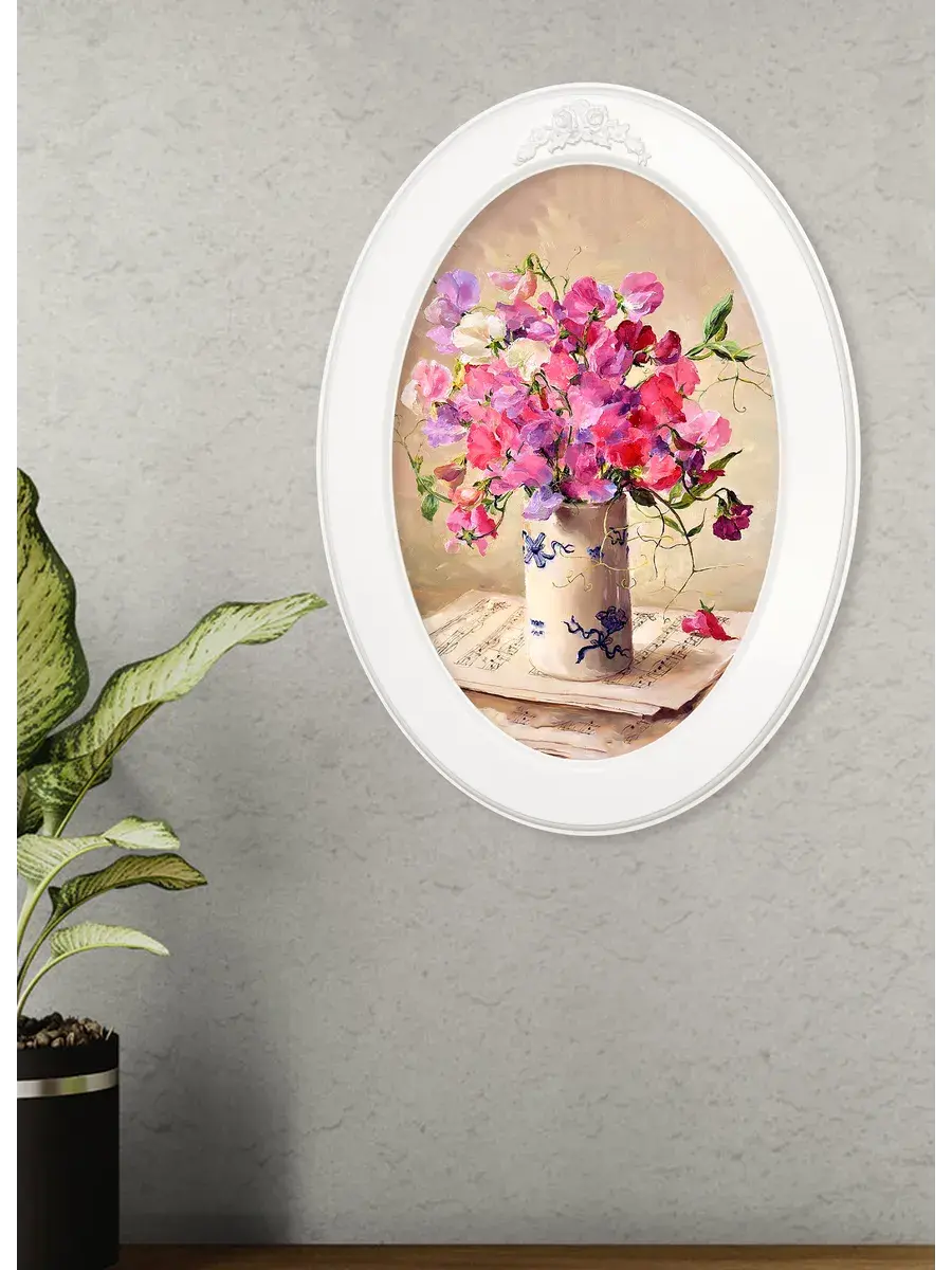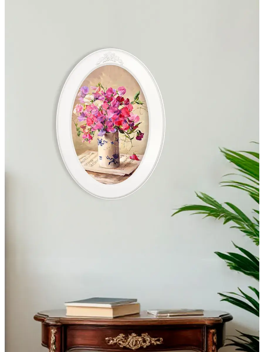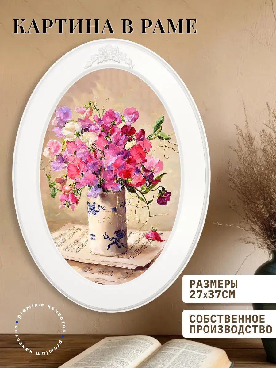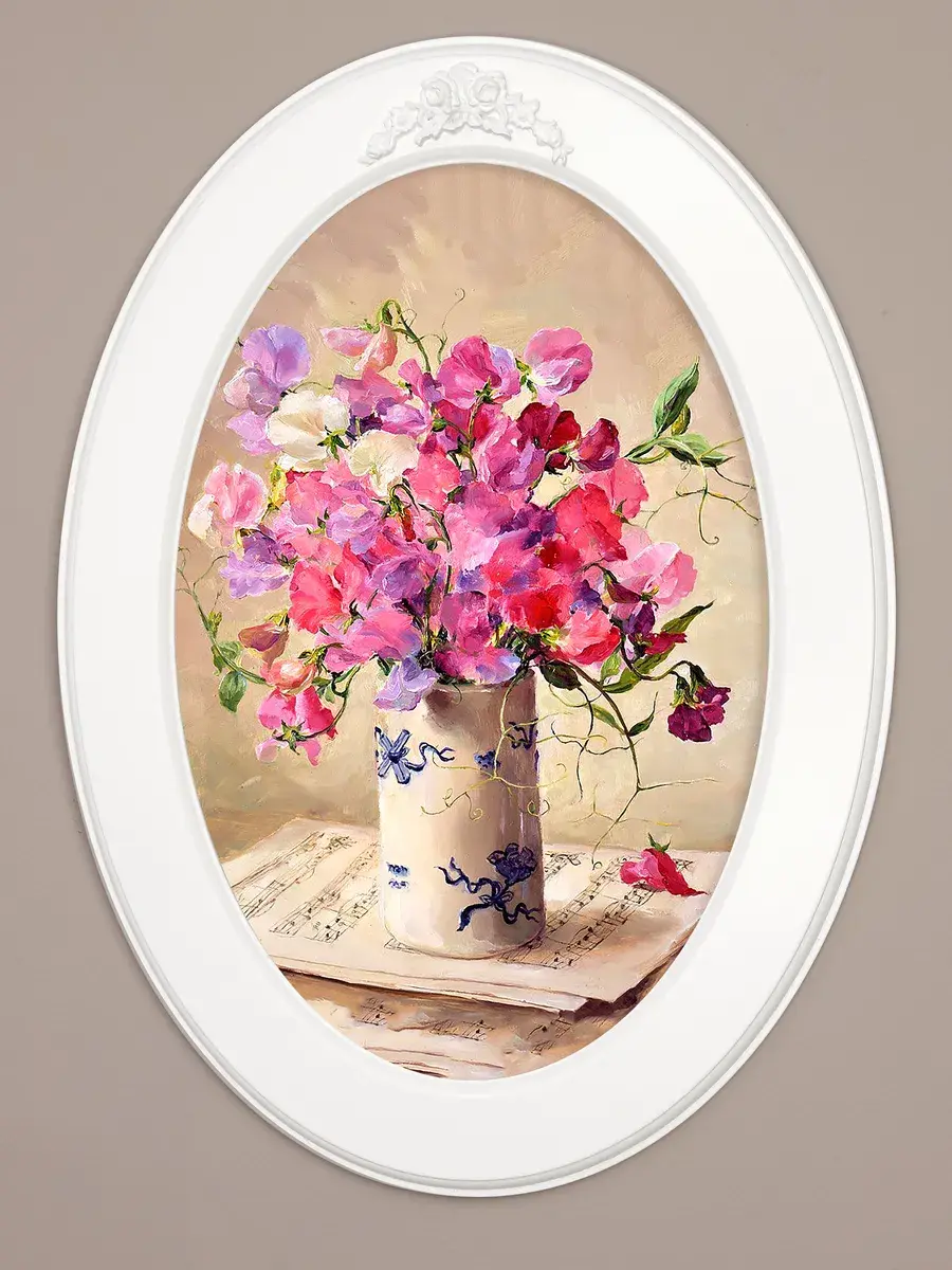Картина напечатана на натуральном холсте, покрыта матовым лаком, оформлена в овальную белую раму с лепниной. Картина станет прекрасным украшением интерьера. Множество вариантов дает возможность создать собственную коллекцию. Картины для украшения в стиле Прованс или для детской комнаты.