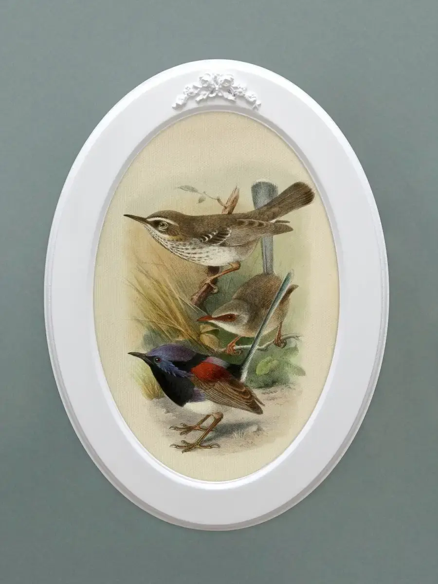 Настенный декор "Винтажные птички" в нежных пастельный тонах. Картина напечатана на натуральном холсте, покрыта матовым лаком для защиты от солнца и пыли, в овальной белой раме с лепниной ручной работы. Картина с птичками станет прекрасным подарком и украшением интерьера дома, на даче или в офисе. Множество вариантов дает возможность создать собственную коллекцию, украсить стены спальни, в кухне, прихожей или детской комнате. Рама изготовлена из цельного листа МДФ 10 мм, не имеет зазоров и стыков. Оформляя интерьер картинами не большого размера в одном стиле Вы создаете уютную атмосферу в доме. Коллекцию картин можно все время пополнять или обновлять новми сюжетами , создавая настроение. Птицы подойдут для интерьера в стиле Прованс, Шеббишик, Классика. Окрашена рама экологичной акриловой эмалью в белый цвет. Размер картины 27х37 см, размер изображения 20х30 см. Крепление для стены в комплекте.