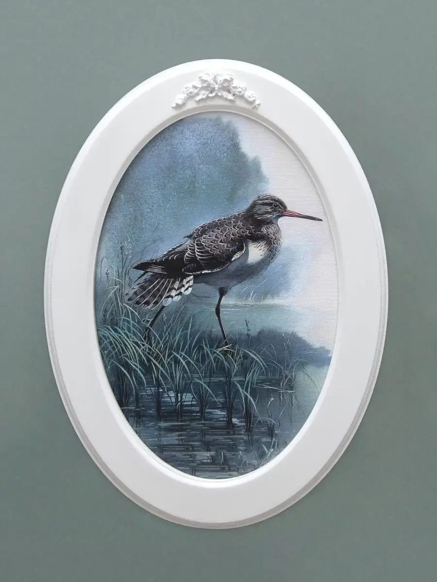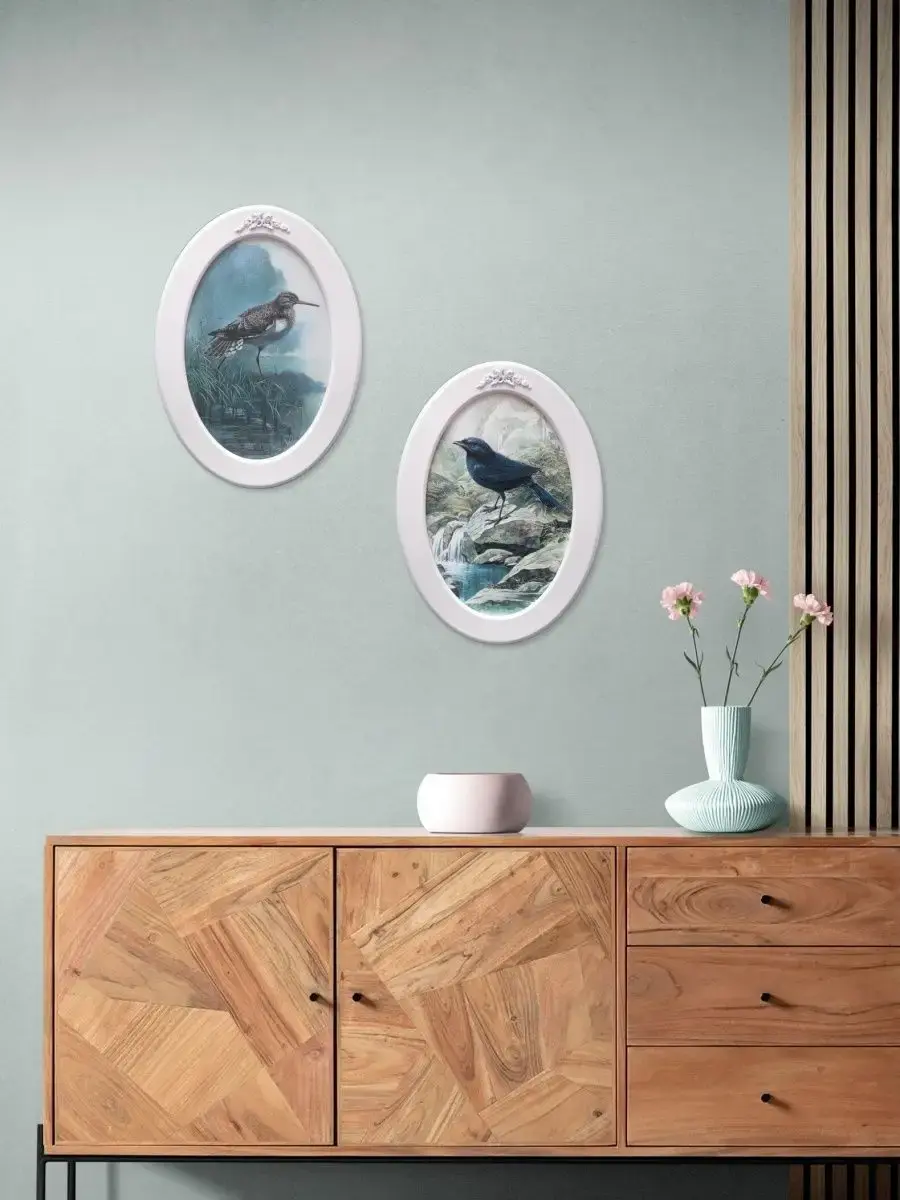 Настенный декор "Винтажные птички" в нежных пастельный тонах. Картина напечатана на натуральном холсте, покрыта матовым лаком для защиты от солнца и пыли, в овальной белой раме с лепниной ручной работы. Картина с птичками станет прекрасным подарком и украшением интерьера дома, на даче или в офисе. Множество вариантов дает возможность создать собственную коллекцию, украсить стены спальни, в кухне, прихожей или детской комнате. Рама изготовлена из цельного листа МДФ 10 мм, не имеет зазоров и стыков. Оформляя интерьер картинами не большого размера в одном стиле Вы создаете уютную атмосферу в доме. Коллекцию картин можно все время пополнять или обновлять новми сюжетами , создавая настроение. Птицы подойдут для интерьера в стиле Прованс, Шеббишик, Классика. Окрашена рама экологичной акриловой эмалью в белый цвет. Размер картины 27х37 см, размер изображения 20х30 см. Крепление для стены в комплекте.